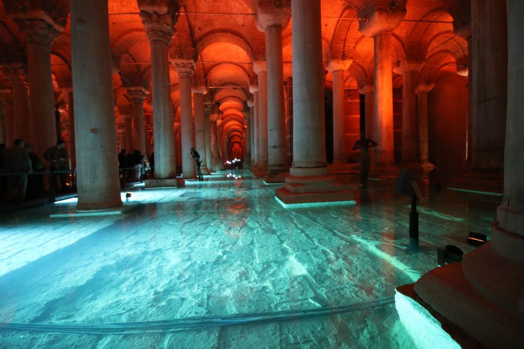 Danach geht es zur Kirche Hagia Irene mit einer wunderbaren Akustik. Seit 3 Jahren wird hier restauriert und bis auf die Balkone und Steine ist die Kirche leer. Danach ein Stück durch das Gewühl der Stadt zur riesigen Zisterne die 100000cbm Wasser fassen konnte. Heute durch Stege begehbar und mit Illuminationen punktuell erleuchtet. Eine unglaubliche Größe für eine Zisterne. Istanbul hat inzwischen mehr als 23 Mill. Einwohner die aber durch ein modernes Wassersystem versorgt werden.