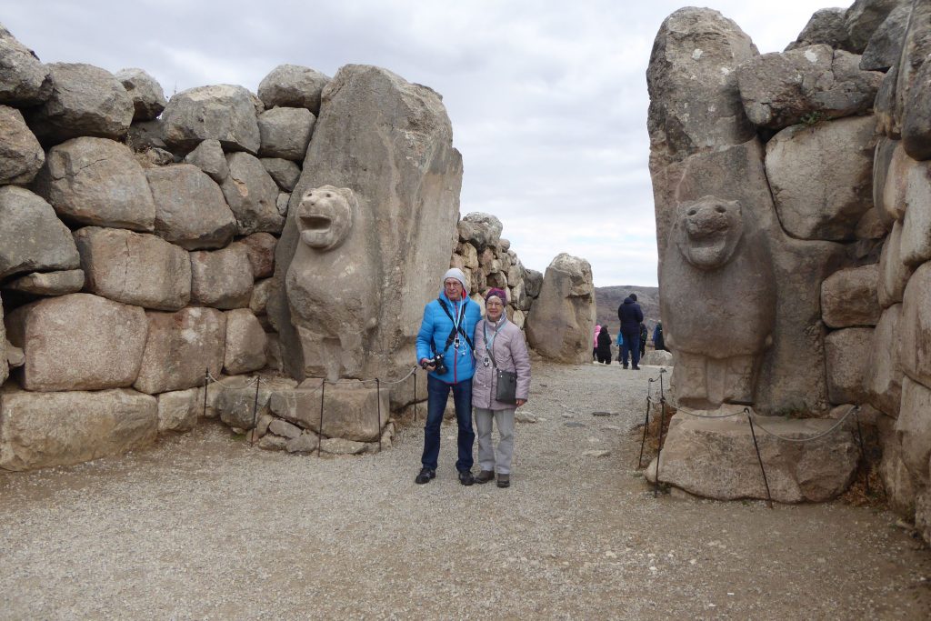 Neben zahlreichen anderen Funden kamen 30.000 meist fragmentarisch erhaltene Tontafeln ans Licht, die mit Keilschrifttexten in hethitischer, alt-assyrischer und mehreren anderen Sprachen beschrieben waren. Auf dem Hochplateau stand der Königspalast dazu kommen Reste von über 30 Tempelbauten hinzu. Die Wohnviertel lagen in der Unterstadt. In der Zeit von 12.000 bis 6.000 v.Chr. hatte das Hethiterreich hier seinen Höhepunkt. Viele der Steinreliefs erinnern an ägyptische Darstellungen. Eine monumentale Anlage die einen Besuch lohnt. Nur gut, dass wir uns mit dicken Jacken und Mützen ausstaffiert hatten. Hier oben auf dem Berg war es lausig kalt und der Wind pfeift uns um die Ohren.