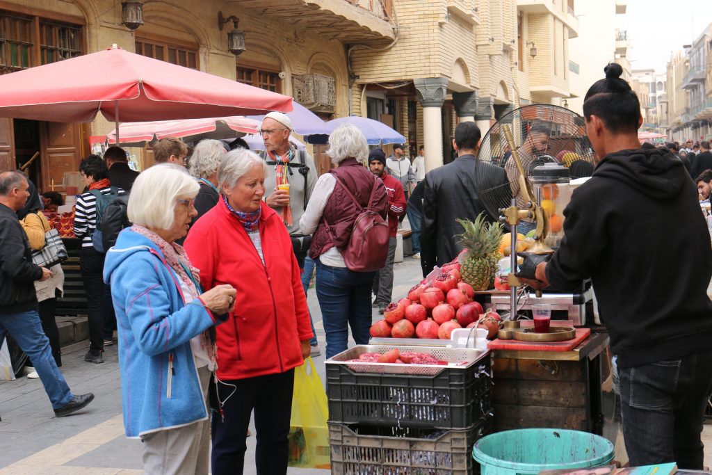 Bei unserem weiteren Stadtrundgang besichtigen wir die 1220 gegründete Universität die in einer Art Moschee untergebracht ist. Der riesige Innenhof der Medrese hat ein sehr schönes und aufwändiges Steinmuster. Alles in Sandstein erbaut, ohne Farben aber durch die Zieselierungen des Mauerwerks ein Highlight. Die einzelnen Bögen sind die 100 Zimmer der Studenten. 1963 wurde die Anlage (Al Mustain Saria) restauriert. Unser Stadtrundgang führt uns durch staubige, quirlige Straßen mit einem unvorstellbaren Verkehrsaufkommen. Um eine Straße zu überqueren stellen sich unsere Guides auf die Fahrbahn und halten den Verkehr an. Alles wuselt durcheinander. Aus 4 Spuren der Straße werden so 6 Spuren denn Handkarren, Mopeds, Tuck Tucks und was sich sonst so bewegen lässt wird als fahrbarer Untersatz benutzt um diverse Waren durch die Gegend zu fahren. Die Stadt ist staubig, schmutzig, und sehr marode. Oft sieht man Gebäude in denen unten schmale Läden etwas verkaufen. Im Obergeschoß gibt es keine Fenster mehr, Bauteile fehlen, Leitungen hängen aus dem Obergeschoß. Unsere Guides erklären uns, das dort oben die Lagerstätten der Geschäfte seien -nun denn.