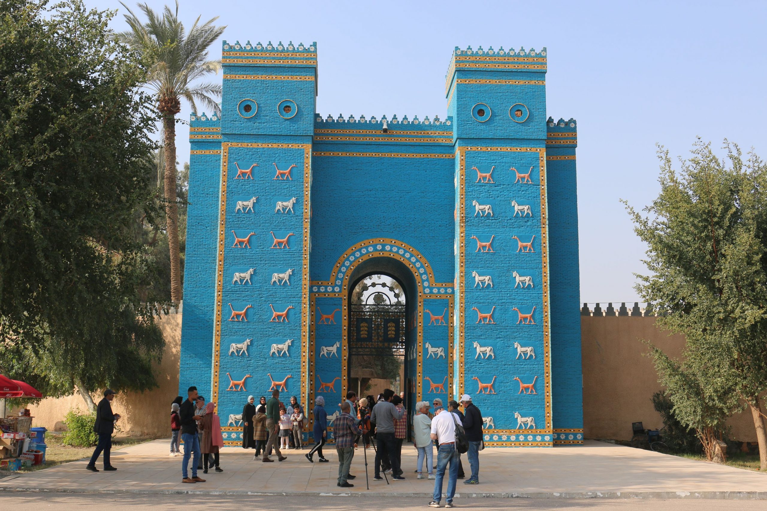 Klaus hat heute Geburtstag und auch Valerie, unser Guide, der momentan zu Hause in Weißrussland ist und in Kuweit wieder zu uns kommt. Klaus will seinen Geburtstag später feiern da z. Zeit unsere Freizeit stark beschränkt ist. Morgens ab 7 Uhr werden die Womos betankt mit je 35 l Diesel. Um 8.30 Uhr starten wir zu unserem 1. Checkpoint wo wir uns wieder sammeln müssen. Heute haben wir allerdings nur 2 x das Vergnügen und so kommen wir fast pünktlich um 11.15 Uhr in Babylon an. Wir gehen gemeinsam mit unseren Begleitern und Haider durch das 1985 neu erbaute Tor in die Anlage die zu Nebukadnezzars Zeiten 10 Mill. qm groß war. Jassin und ein ortsansässiger Führer erzählen uns auf englisch was hier zu sehen ist.