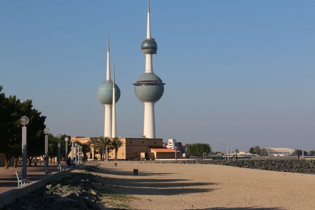 Der Platz in Kuwait ist ein großer Parkplatz ohne alles. Lino schleppt Hans mit dem Fahrzeug in die Werkstatt. Wir warten auf einen Mann, der die Steinschläge an 4 Windschutzscheiben reparieren will und gehen vorher kurz einmal zum Wasser. Von hier können wir weit entfernt die große Brücke sehen die über den Golf von Kuweit verläuft, dahinter der indische Ozean. Bei der Einfahrt in die Stadt sehen wir die großen Türme die an die Wolkenkratzer in Dubai erinnern. Es wird schon dämmrig, als der Werkstattmensch für die Scheiben kommt. Aber es geht recht schnell und mit 25 € ist der Steinschlag behoben. Zum in die Stadt gehen haben wir keinen Nerv. Uns steckt der Schock noch in den Knochen und wir sind nur müde und haben keinen Antrieb. Zum Reparieren unseres Autos kommen die Männer heute nicht mehr weil kein Material zur Verfügung steht und Lino und Hans noch nicht zurück sind. Wir hoffen, dass bei Hans alles gerichtet werden kann, damit er morgen mit uns über die Grenze nach Saudi Arabien kommt. Hier in Kuweit haben wir keine Simkarten und sind telefonisch nicht erreichbar.