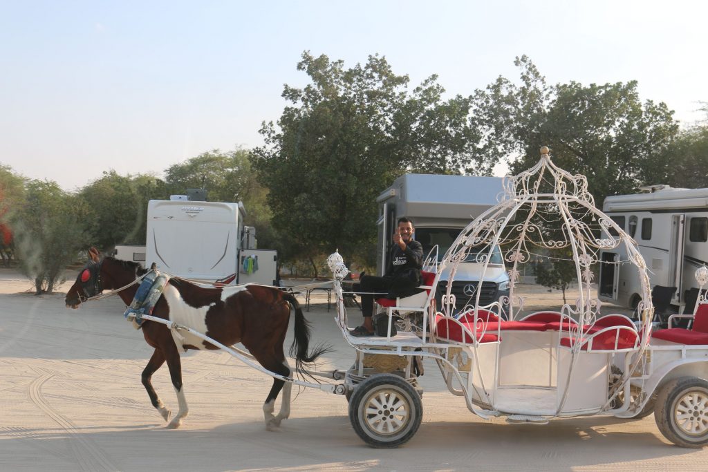 Heute ist ein langer Fahrtag. 6 Uhr aufstehen, 8 Uhr starten. Die Strecke führt bis auf den 1. Teil über gute Autobahnen. Die Gegend ist eintönig, nur Sand und etwas Gestrüpp. Auf knapp 200 km gibt es keine Tankstelle und wir haben schon Panik, dass wir liegenbleiben. Dann kommt die rettende Anzeige an der Straße. Unterwegs machen wir einmal Pause und ich lege mich ins Bett. Mein Magen rebelliert. Ca. 15.30 Uhr kommen wir in Al Hufuf im Park an. Ein sehr langgezogenes Areal und überall Sitzen Personen zwischen den Palmen und Büschen. Unser Platz ist ein großer Sandplatz. Pferdekutschen und Kamelhalter sind hier um uns zum Kutsche fahren oder Kamelreiten zu animieren.
