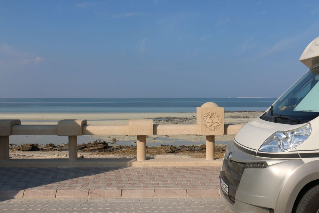 Ein kurzes Meeting um 9 Uhr und wir machen uns auf den Weg zum Sammelpunkt vor der Grenze nach Saudi Arabien. Unterwegs sehen wir Ölfelder und große Raffinerien. Hans wird von Lino wieder abgeschleppt. Die Werkstatt konnte den Schaden nicht beheben. Jetzt wird am heutigen Stellplatz das Auto auf einen Tieflader gebracht und nach Riad abtransportiert. Hans und Lucero fahren mit Ali mit dem Pkw mit. Um 11.30 Uhr sind alle am Sammelpunkt und die Grenzabfertigungen in Kuwait gehen einigermaßen schnell. In Saudi Arabien dauert es etwas länger, weil wieder Fingerabdrücke genommen werden. Im Passbüro werden auch die Carnets wieder ausgestempelt und wir bekommen dort noch einen Tee serviert. Unser Stellplatz am indischen Ozean liegt sehr schön und ist mit einer schönen Strandpromenade versehen und von Palmen gesäumt. Leider ist wieder keine Zeit zum Verweilen. Die Männer fahren in Gruppen zum nächsten Shop für Simkarten wo man auch wieder einen Fingerabdruck für den Kauf hinterlassen muss. Bei Dunkelheit kommt der Tieflader der viel zu klein ist und die Männer helfen mit Brettern und Keilen, das Auto darauf zu bekommen. Danach fahren Hans und Lucero mit Ali und seinem Pkw hinterher. Bis Riad sind es 800 km.