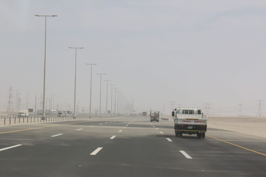 Ein schöner Sonnenaufgang vor uns im Meer. Ein Wasserwagen kommt zum Betanken unserer Fahrzeuge dann geht es auf die Strecke. 340 km nur Autobahn. Auf der ganzen Strecke wie schon in den letzten Tagen seit Saudi Arabien nur Sand, mal ein paar Sträucher. Sehr eintönig. Wir haben inzwischen 31°, starker Wind mit Sandstürmen.