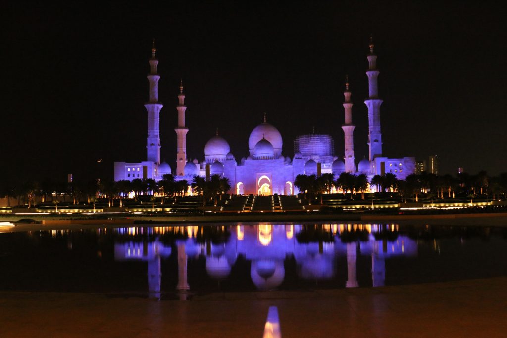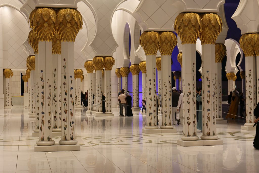 Dann kommen wir endlich an der Moschee an, die wir heute bei Dunkelheit besichtigen wollen. (Neben der Moschee ist das Grabmal des Vaters des jetzigen Scheichs.) Dafür müssen wir wieder unsere Verkleidung anziehen und eine endlose Passage durch einen Basar laufen. Die Moschee ist blau angestrahlt und sieht wirklich sehr schön aus. Überall fällt das Blumenmuster auf, ob in der Außenfassade, den Fliesen auf dem Fußboden, den 1.800 Säulen die oben mit einem goldenen Palmenblattkranz enden oder der riesige Teppich im Innenraum der die Kronleuchter an der Decke. Die Moschee ist ein richtiger Augenschmaus. Wenn man sich nicht verhüllen müsste wäre alles noch viel schöner.
