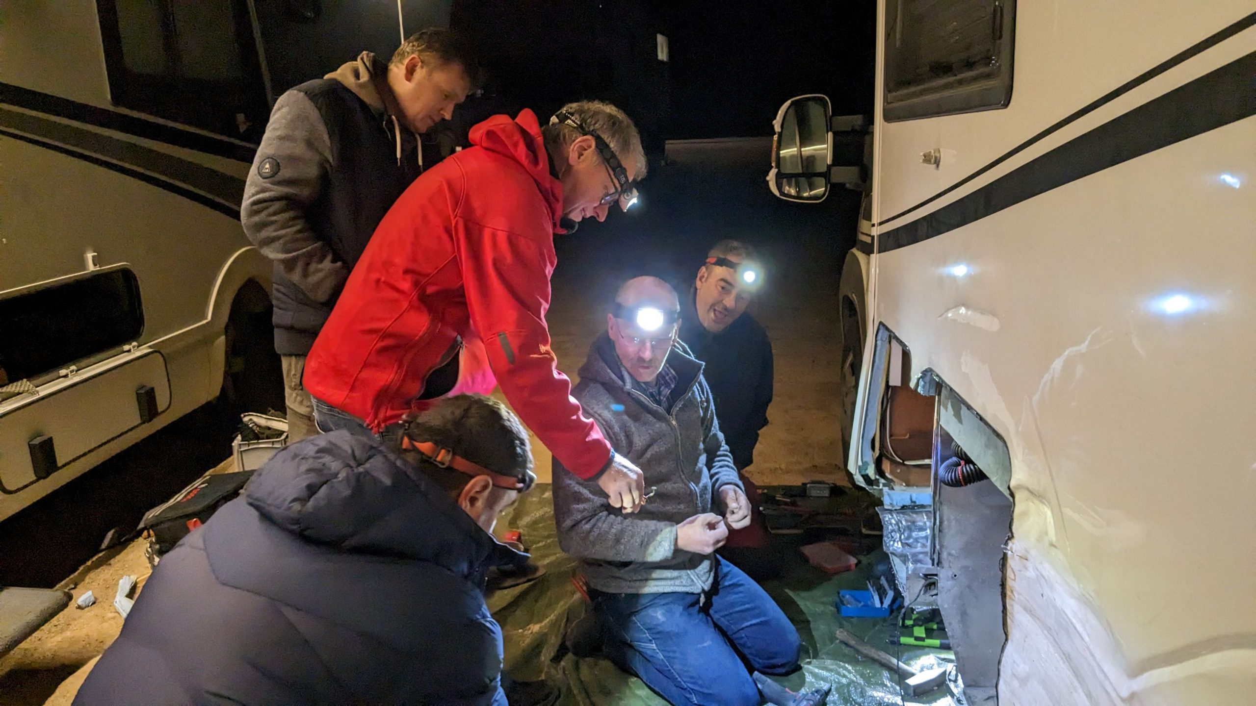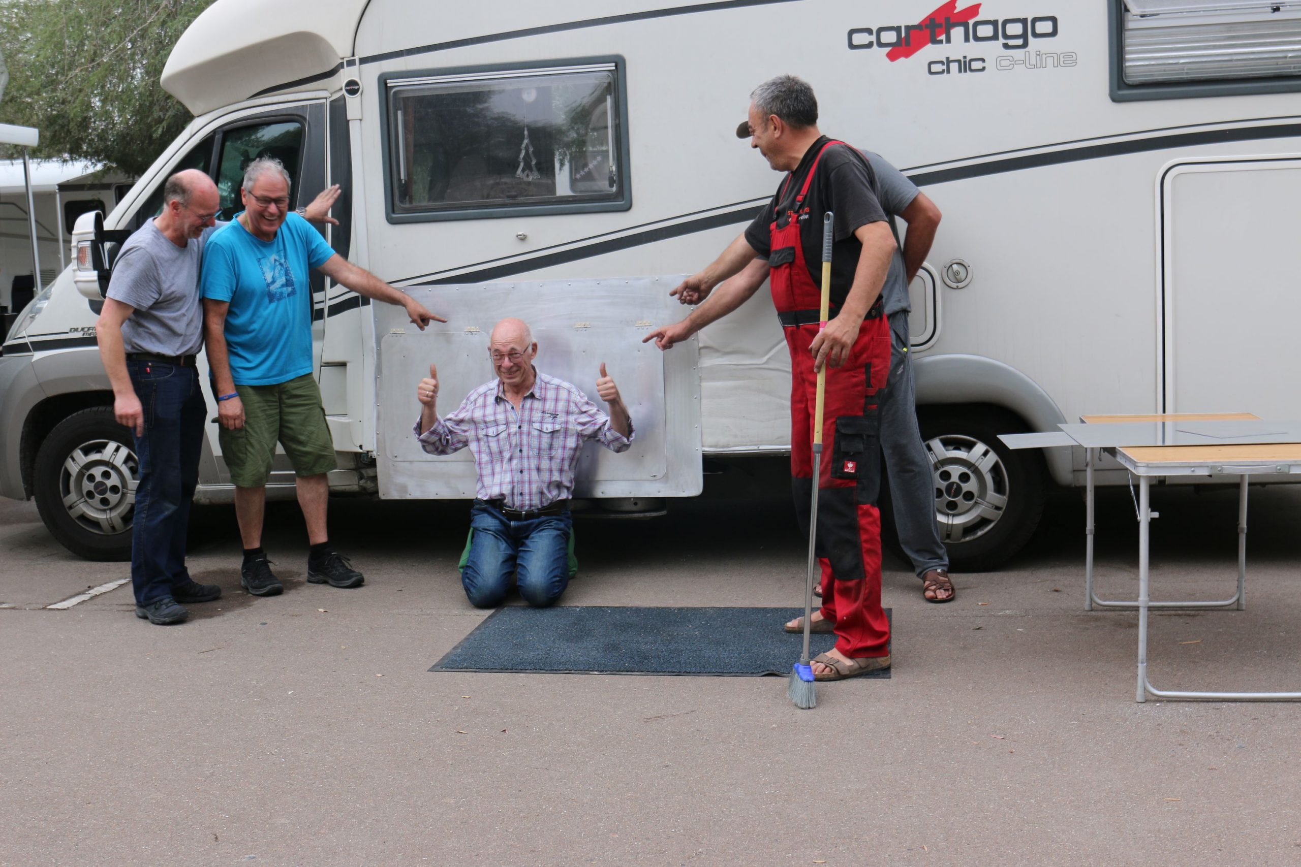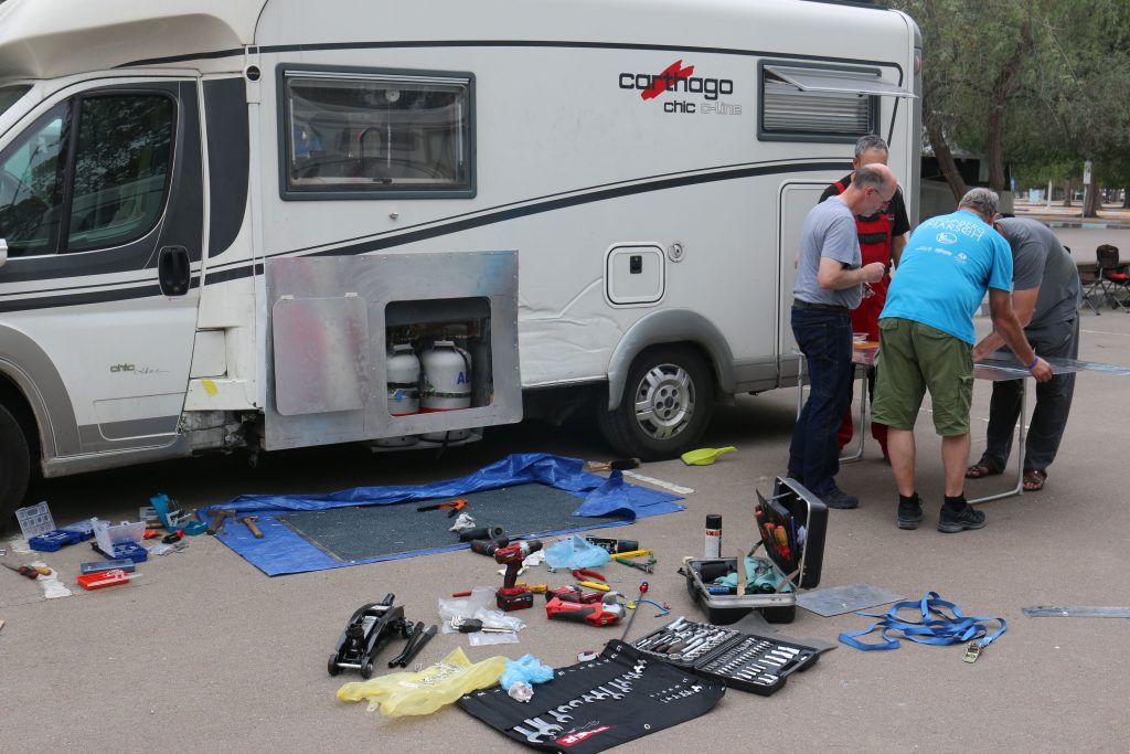Heute ist ein Tag zum Erholen – eigentlich, aber bei uns ist heute ab 10 Uhr großes Schrauben, sägen, flexen, hämmern, bohren etc. Unsere 4 Handwerker sind unermüdlich den ganzen Tag in Aktion und sägen aus dem gekauften Metallstücken 2 Einschnitte für das Batterie- und das Gasfach heraus, schneiden dafür die Klappen zu, bauen ein Bodenbrett ein, worauf die Batterien befestigt werden.