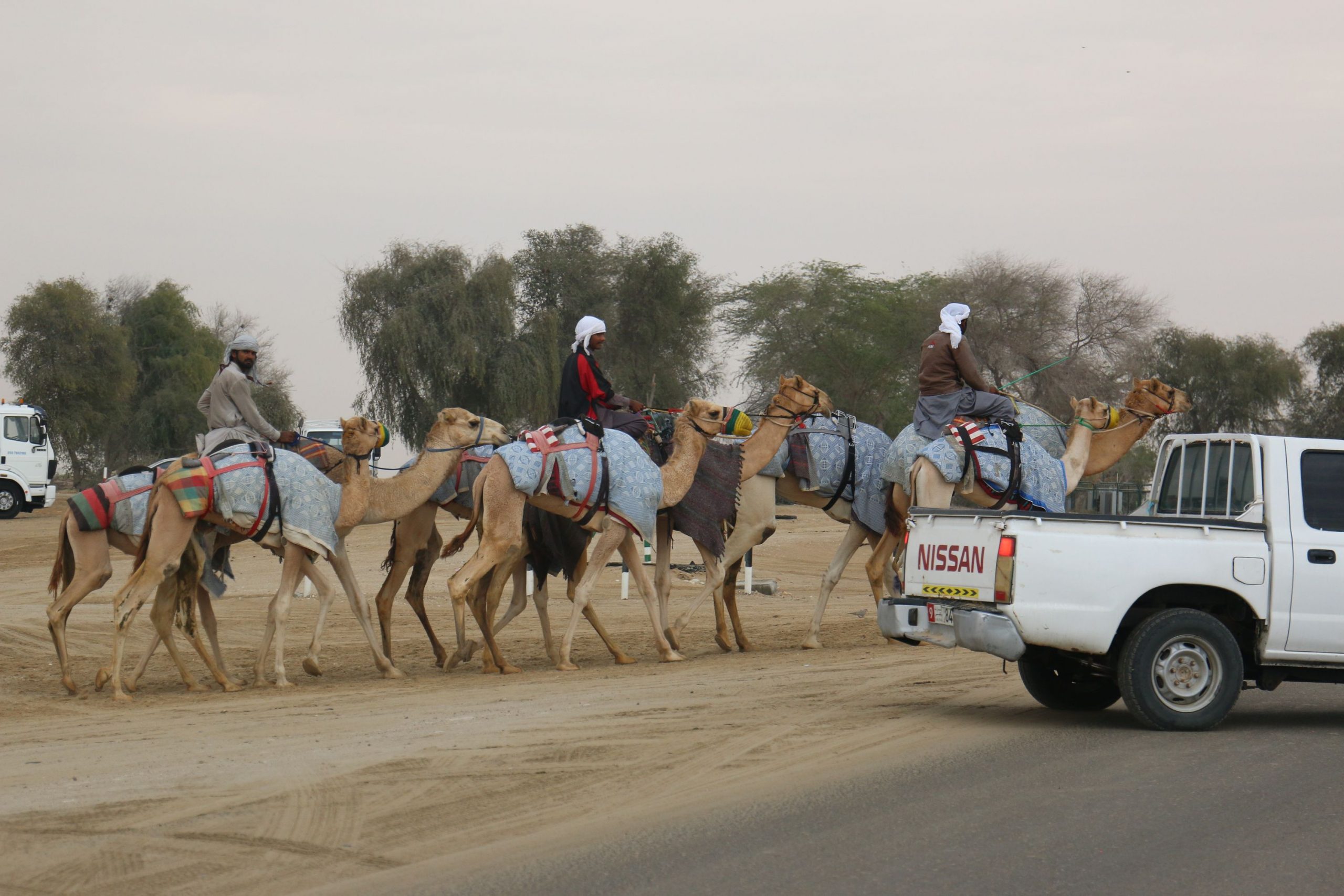 Die heutige Strecke ist kurz aber wir fahren einen Umweg über 2 Kamelrennstrecken, wo z. Zt. täglich Kamelrennen stattfinden. An der ersten Stelle sind gerade die Rennen beendet und wir sehen noch einige Kamele mit Reiter die Bahn verlassen.