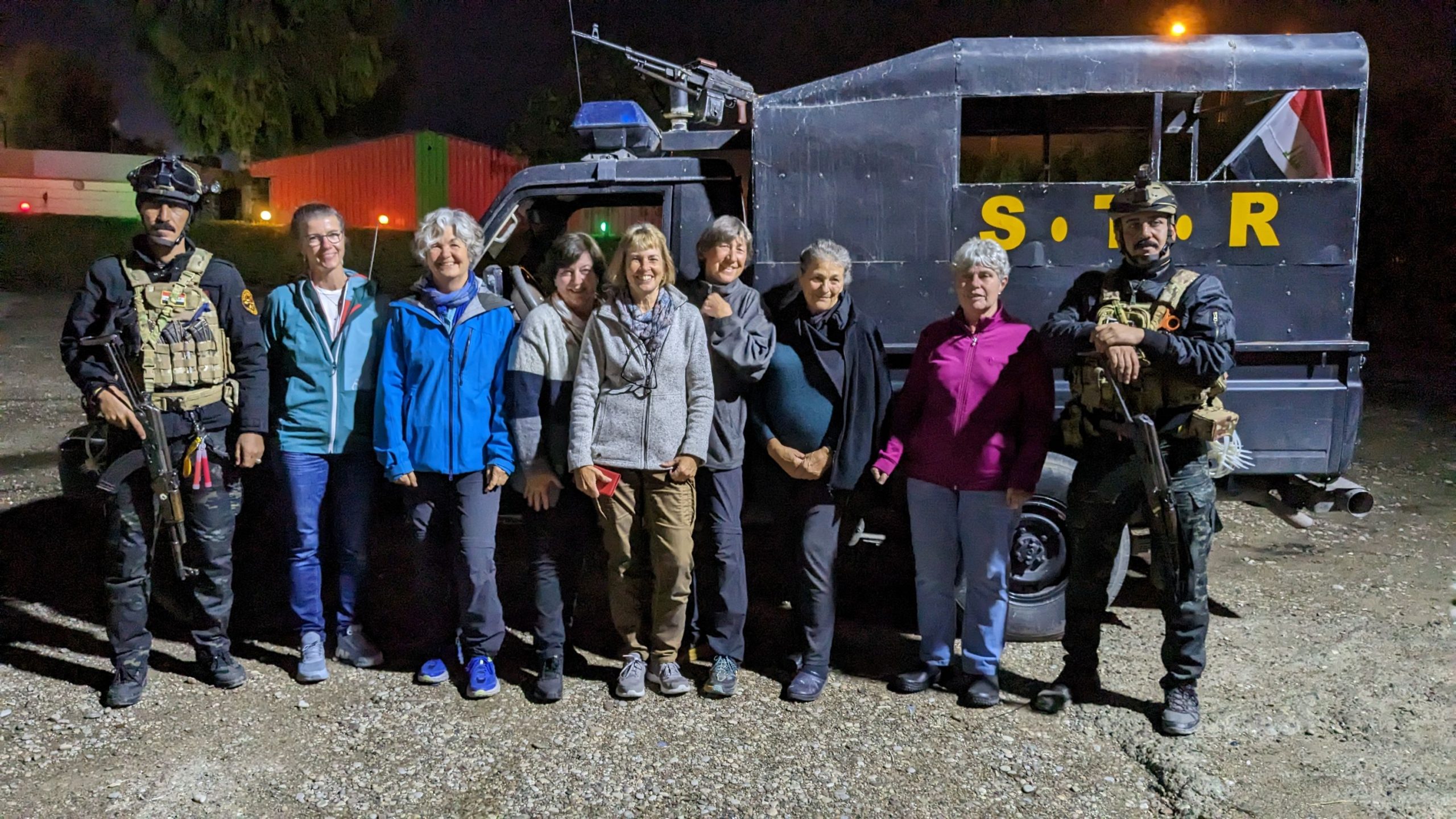 Um 7.45 Uhr fahren wir mit dem Bus zum Flughafen. 8km vor dem Flughafen ein Kontrollpunkt. Unsere Pässe werden eingesammelt, unsere Aufpasser gehen damit zum Kontrollpunkt. Es dauert fast 1 Stunde bis wir weiterfahren können. Einchecken und Abfertigung gehen zügig und wir starten pünktlich um 10 Uhr und sind um 11 Uhr in Erbil. Dort wieder in den Bus, zum Stellplatz und zügig die Autos startfertig gemacht. An der Ausfahrt von Erbil haben wir eine Tankstelle genannt bekommen wo der Diesel eine ordentliche Qualität haben soll. Alle tanken, dann geht es ca. 50 km bis kurz vor den Kontrollpunkt wo wir alle gemeinsam reinfahren. Ca. 30 Min. Wartezeit, dann weiter nach Kirkuk. Vom Kontrollpunkt aus haben wir eine schwer bewaffnete Begleitung an unserer Seite. Ein Militärfahrzeug mit 4 mit Maschinengewehren ausgerüsteten Männern fährt vorweg, unsere anderen 4 Begleiter dahinter und am Ende noch ein Militär Jeep mit 4 schwerbewaffneten Soldaten. Es sind vereinzelt grüne Felder zu sehen und es sieht aus wie frische Getreidefelder. Vor Kirkuk wird es nur noch grau und die ganze Landschaft eine einzige Müllhalde. Es wird bald dämmrig und wir fahren mit Warnblinklicht Kolonne bis zu unserem Stellplatz. Auf dem Stellpatz machen wir und auch die Soldaten Fotos und Selfies. Alle sind sehr nett und freundlich und sie haben uns nur zu unserem Schutz begleitet und werden heute Nacht uns bewachen. Morgen werden wir vom nächsten Kontrollpunkt sicherlich von einer anderen Truppe begleitet.