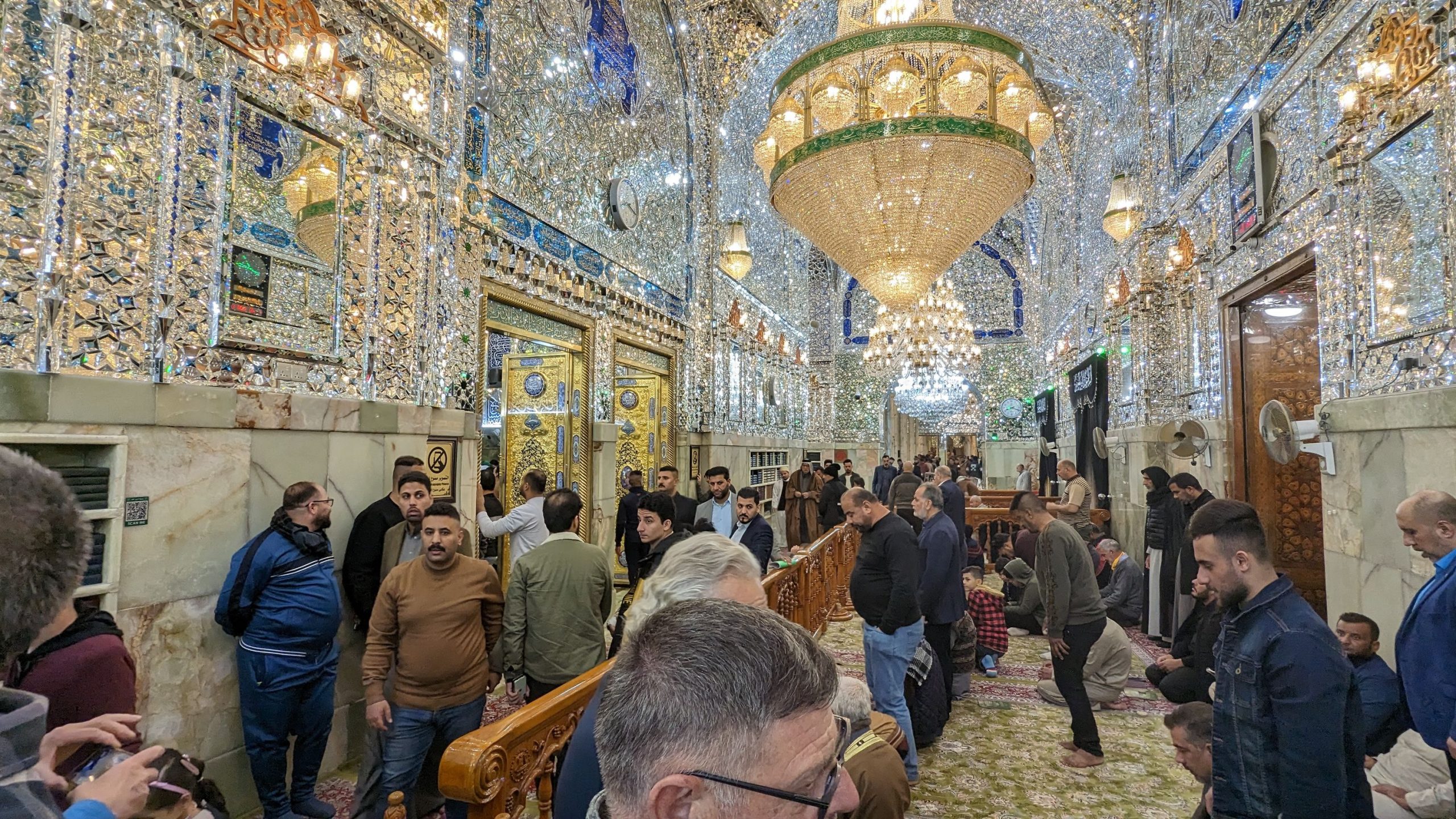 Wir kaufen noch schnell Brot und um 18.45 ist Meeting, danach geht es mit dem Bus zum heiligen Schrein von Imam Ali, dem Schwiegersohn vom Propheten Mohammed. Dafür wurden für uns Nikabs von den irakischen Begleitern gekauft, damit wir nicht die benutzen in der Moschee ausleihen müssen. Wir müssen ein ganzes Stück durch den Basar laufen um in die Moschee zu gelangen. In unseren Nikabs kommen wir uns vor wie in einem Nachthemd. Die äußere Umgehung des Schreins ist nicht überdacht aber mit Sonnenschirmen die sich bei Sonne automatisch öffnen versehen. Jetzt ist es dunkel und die vergoldeten Säulen angestrahlt. Schöne Mosaiken zieren die Außenwände. Wir müssen die Schuhe ausziehen und gehen nach Männern und Frauen getrennt in das Innere und zu dem Schrein. Hier gibt es nur noch Gedränge und Geschiebe und manchmal auch einen Knuff in die Seite wenn man nicht gleich weiter geht. Aufseherinnen mit verschleiertem Gesicht und einem Staubwedel behindern uns beim Fotografieren, es ist aber nicht verboten.