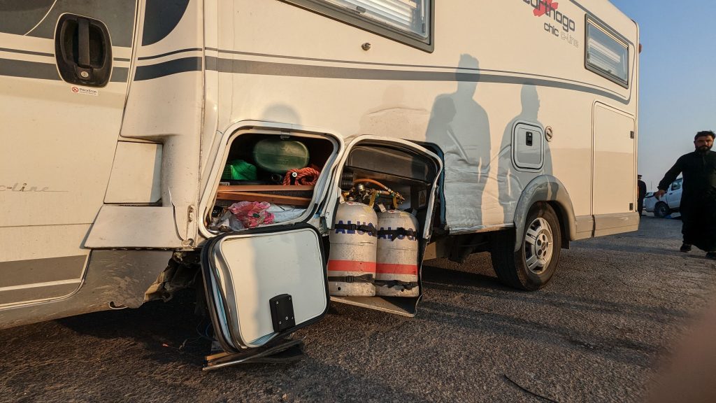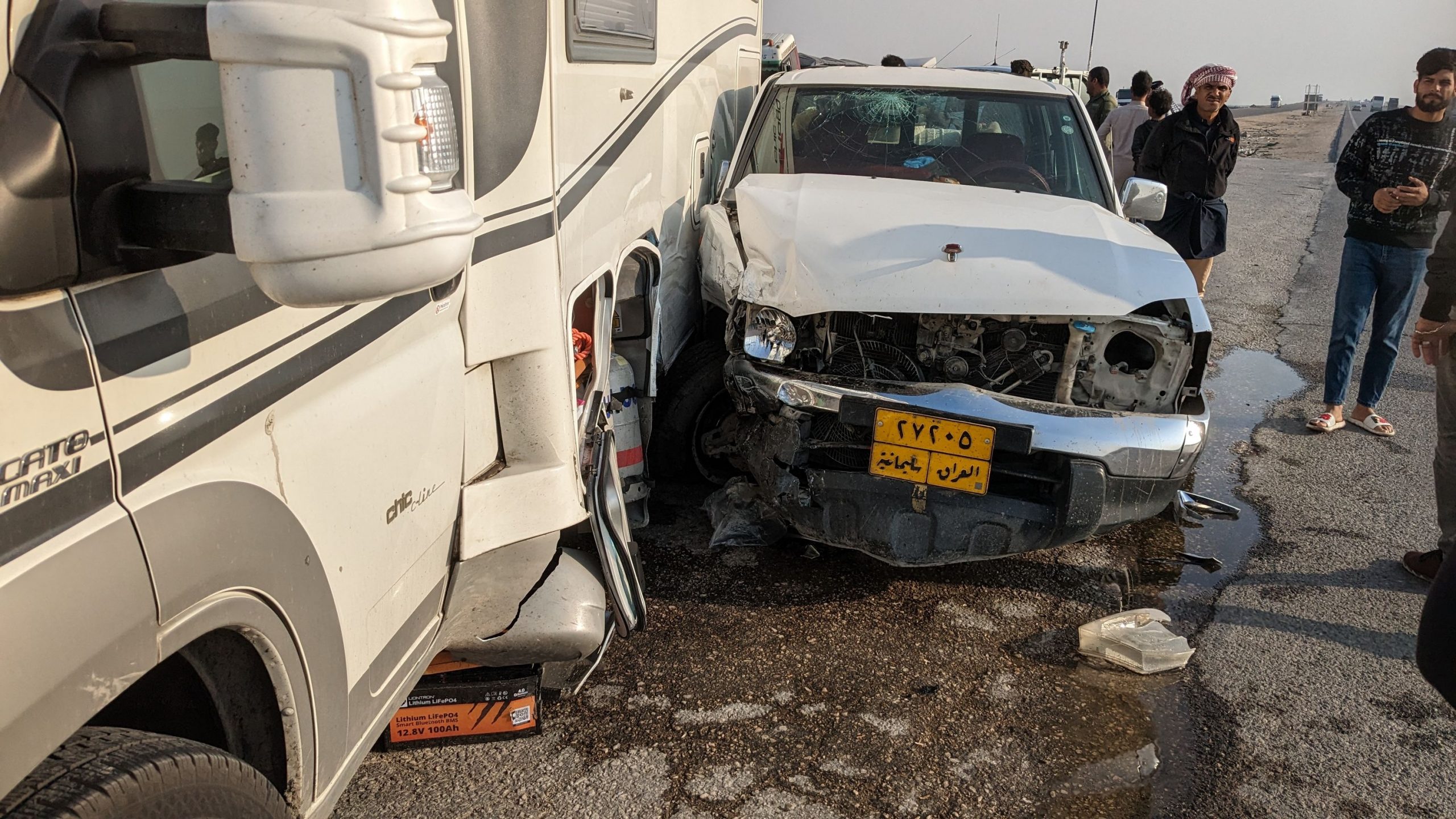 Wir rufen unsere Reiseleitung an und geben die Koordinaten durch. Wir haben keine Pässe dabei weil die Reiseleitung sie für die vielen Kontrollen gleich gesammelt abgibt. Bald stehen ca. 6 Polizisten um uns herum und verlangen die Pässe. Sie können nur irakisch sprechen und wir versuchen mit dem Handy zu übersetzen aber immer wieder wollen sie Pässe sehen. Erst als Gerd schreibt und übersetz, dass wir von der irakischen Tourismusbehörde begleitet werden, werden die Polizisten leiser und inspizieren unser und das andere Auto. Im anderen Auto ist der Beifahrer am Kopf verletzt und wird mit der Ambulanz weggebracht. Uns ist außer einem Schock der tief sitzt nichts passiert. Da um das Auto eine Horde Männer steht, traue ich mich nicht heraus. Nach ca. 1 ½ Stunden kommen Oleg und Mister Sala von der Tourismusbehörde und Oleg übergibt unsere Pässe. M. Sala beruhigt uns und sagt, er regelt alles. Er redet auf die Polizisten ein und plötzlich werden sie freundlicher. Dann muss noch die Verkehrspolizei kommen und den Schaden aufnehmen, dann kommt ein Abschleppwagen und bringt den Pickup weg. Erst dann sehen wir den Schaden an unserem Auto. Die Gasflaschen sind mit dem Gaskasten abgerissen. Gerd dreht gleich die Flaschen zu und stellt sie ins Auto. Der Kasten hängt herunter, die Klappe ist abgerissen. Dass Batteriefach der Aufbaubatterie ist herausgerissen und die Lithium Batterie aufgeplatzt. Die Polizei hat sie erst mitgenommen zum Revier und später haben wir sie einem Polizisten geschenkt.