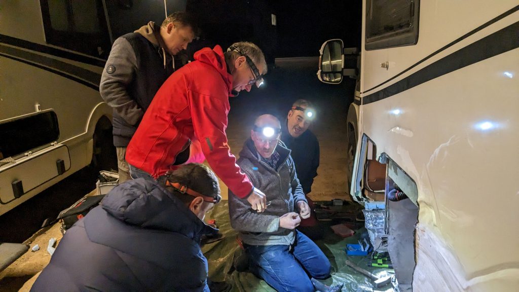 Lino und Claudia unsere Tourbegleiter kommen uns zu Hilfe und Oleg fährt zurück zur Gruppe. Gerd, Sala und Lino gehen in die Station und es finden Verhandlungen statt und sie warten auf den Verletzten, der aus dem Krankenhaus zurückkommt. Er hat eine Kopfverletzung, war nicht angeschnallt (ist hier keiner). Nach längeren Verhandlungen muss Gerd um 20.30 Uhr seinen Fingerabdruck hinterlassen und etwas unterschreiben. M. Sala beruhigt uns und verspricht, alles zu regeln. Danach fahre ich mit Lino und Gerd mit Claudia zum Stellplatz wo wir kurz nach 21 Uhr eintreffen. Walter, Roman, Ararat und ein paar Frauen warten auf uns. Die Männer und Lino packen sofort zu und es ist unglaublich, wie sich die Männer in die Arbeit stürzen, damit wir morgen mit ihnen den Grenzübergang machen können. Alles wird auseinander genommen und geschraubt, gesägt, gehämmert, gezurrt, mit der Flex gearbeitet. Es ist unglaublich, wie hilfsbereit die Mannschaft ist und uns betreut. Ute bringt uns Tee, Claudia wärmt unser Essen von gestern auf. (Bei uns geht kein Licht, kein Kocher, kein Wasser.) Es wird eisig kalt im Womo. Die Männer arbeiten bis 2 Uhr nachts, dann ist die Ersatzbatterie für den Aufbau angeschlossen und die Elektronik funktioniert wieder.