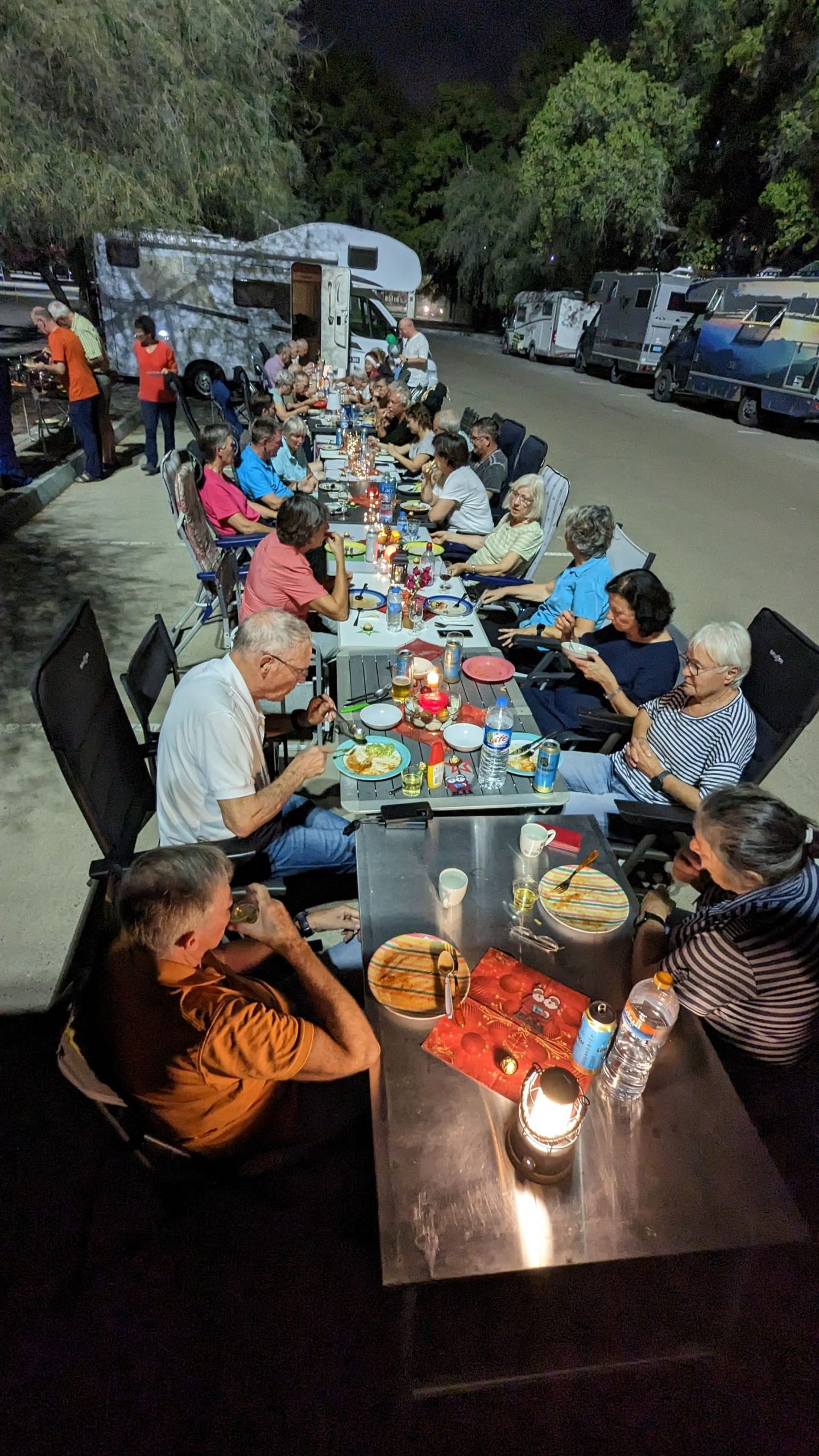Unser Stellplatz in Abu Dhabi für die nächsten 3 Tage liegt am Stadion, zwar neben einer Straße aber es soll nicht so laut sein. Ab 18 Uhr ist gemeinsames Weihnachtsessen angesagt. Jeder kocht etwas. Es soll verschiedene Nudeln und verschiedene Soßen geben. Ich koche 500 g Spirelli und Tomatensoße meiner eigenen Tomaten. Die Soße ist schon fertig in Gläsern. Die Tische und Stühle werden zusammengestellt und die fertigen Sachen kommen auf einen Extratisch. Heike hat Dekosterne auf den Tischen verteilt, jeder bringt seine Weihnachtsdeko mit ein. Und dann macht Lino den Küchenchef und verteilt auf den mitgebrachten Tellern was gewünscht wird. Es ist reichlich da und alle werden satt. Auch ich esse ein paar Nudeln und meine Tomatensoße.
