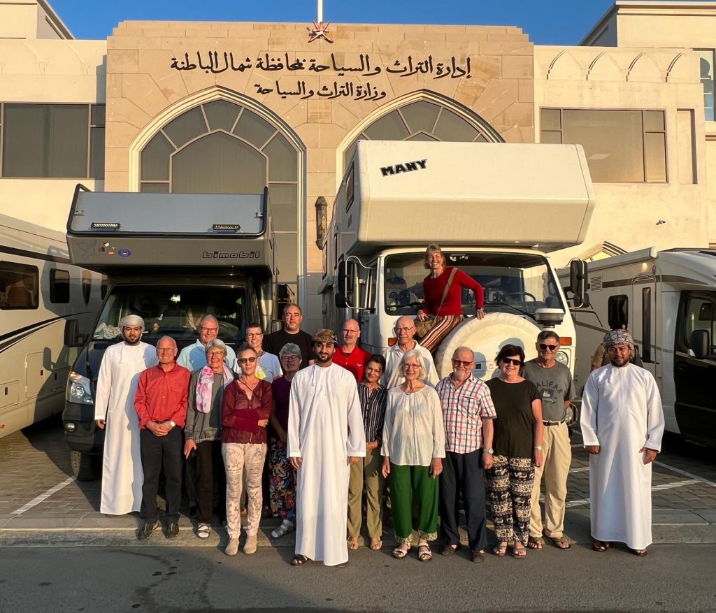 Um 7.30 starten wir bereits wieder mit den Womos zum Tourismusministerium. Gestern Abend war noch ein Vertreter des Tourismusministeriums bei den Wohnmobilen und hat uns eingeladen, heute Morgen sie zu besuchen. Es wurde extra ein Parkplatz für uns vor dem Ministerium abgesperrt und nach mehreren Gruppenbildern mit den Autos und mit der gesamten Gruppe wurden wir hereingebeten und bekamen arabischen Kaffee und Datteln serviert und es wurden verschiedene Gespräche geführt. Natürlich musste man auch in einzelne Fahrzeuge hineinschauen.
