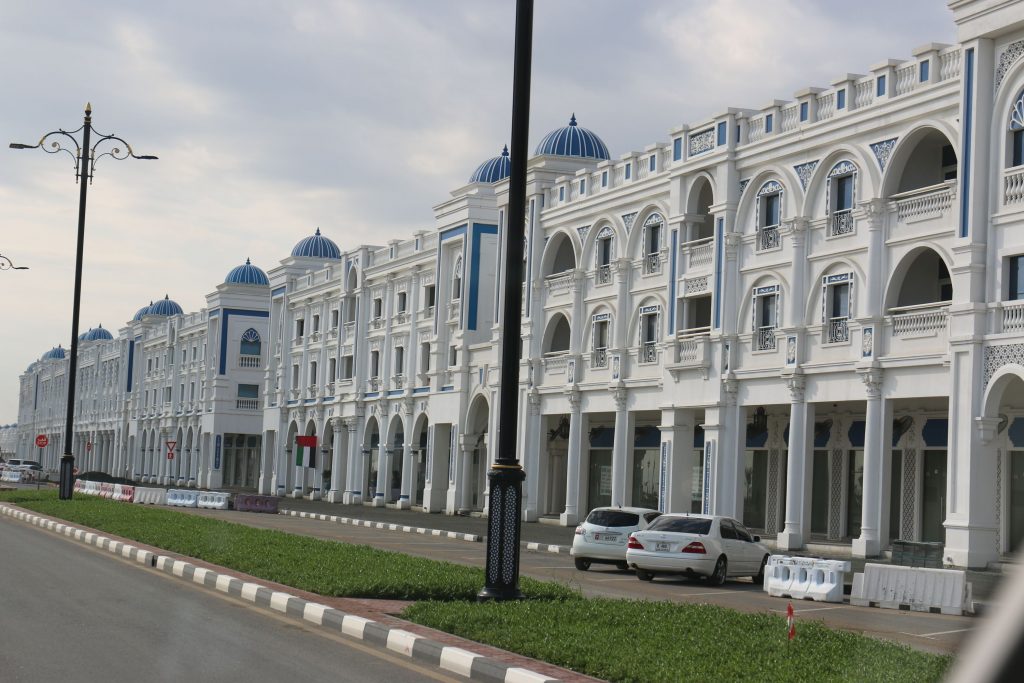 Zum Grenzübergang treffen wir uns kurz vor der Grenze und fahren mit 8 Fahrzeugen in den Grenzbereich. Auf VAE Seite geht es recht zügig, aber auf omanischer Seite muss das Carnet de Passage abgestempelt werden und das dauert endlos. Erst stürzt der Computer ab, dann weiß der Beamte nicht, was er mit dem Carnet machen soll. Irgendwann klappt es dann doch und es geht zum Zoll, wo in die Autos geschaut wird. Unser neuer Landesguide Silas stellt sich vor, der uns jetzt begleitet. Unterwegs sehen wir viele neue Häuser die in Reihen gebaut sind aber noch leer stehen. Unten sind Läden vorgesehen. Die Häuserzeilen sind sehr hübsch in blau/weiß gehalten.