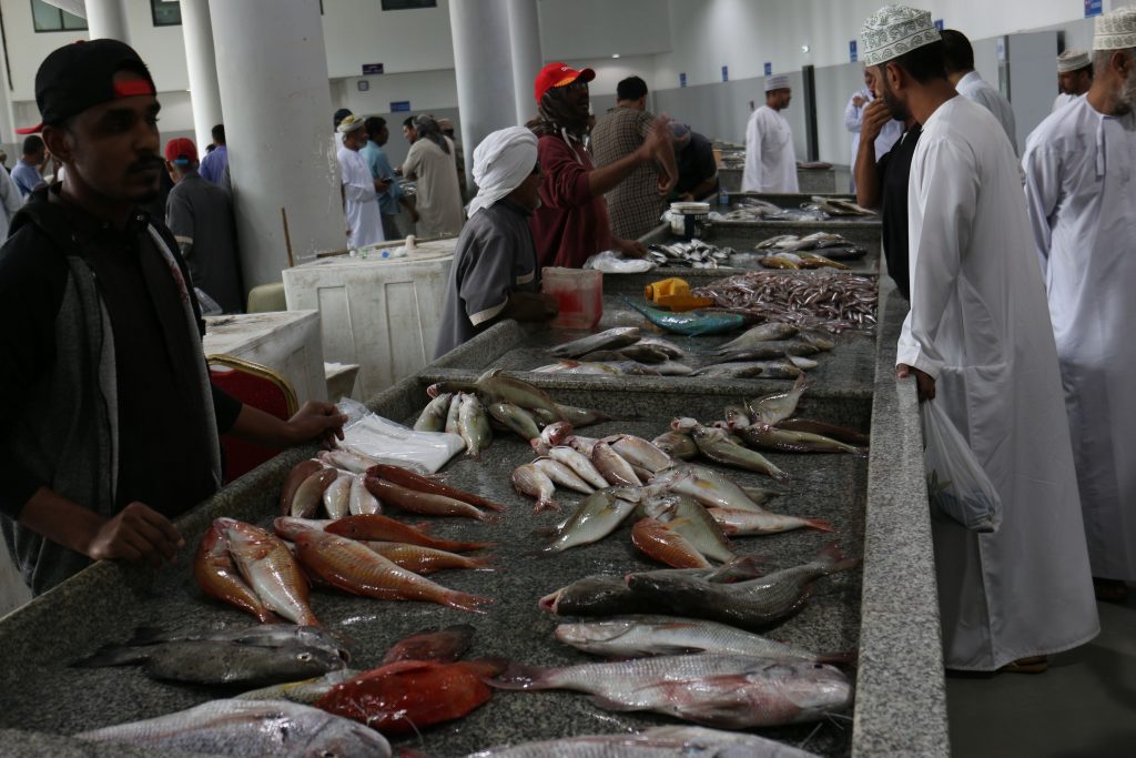 Danach wollen wir keinen weiteren Start mehr sehen und gehen zurück zu den Kleinbussen. Wir fahren nach Barka zur Fischauktion, die jeden Morgen bis 11 Uhr stattfindet. Die Fischauktion ist fast vorbei, nur noch ein paar Fische liegen vor dem alten Herrn, der seit Jahren die Auktion leitet, erzählt uns Valery, der ihn seit Jahren dort sieht. An vielen Stände liegen diverse Fische von klein bis groß. Tunfische, Barrakudas, Haifischflossen, Doraden, Papageienfische, Red Snapper, und viele andere die wir nicht kennen kann man hier kaufen ohne an der Auktion teilzunehmen.