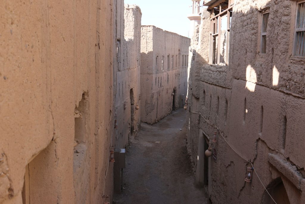 Die Nacht war ziemlich unruhig, immer wieder kamen Pkws auf den Parkplatz und aus dem Park hinter uns die Picknickbesucher. Morgens lassen wir uns etwas Zeit und fahren als erstes zum Einkaufen, danach in Rustaq hinter dem Fort die alten Qusra Wohnviertel mit den verfallenen Lehmbauten ansehen. Es sind nur noch Ruinen der Lehmbauten erhalten und dazwischen stehen neuere Häuser. Alles sieht sehr heruntergekommen aus und nicht unbedingt als Vorzeigeobjekt.
