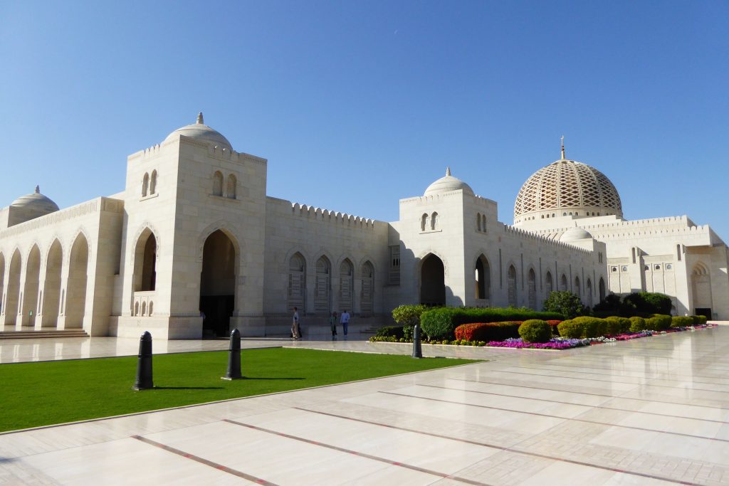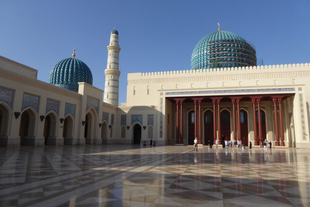 Um 9 Uhr geht es mit dem Bus zur Stadtbesichtigung. Als erstes fahren wir zur landesgrößten Sultan Qaboos-Moschee mit ihren 5 Minaretten. Heute hat Christine Salim abgelöst. Sie führt uns heute sehr kurzweilig durch den Tag mit vielen interessanten Geschichten und Erfahrungen. Sie ist als Deutsche seit vielen Jahren im Oman und hat hier mit Salim eine Reiseagentur aufgebaut. Sie war mit einem Omani verheiratet und hat einen guten Einblick in Sitten und Gebräuche. Wir gehen auf einem Seitenweg in die Moschee und hier sind in den einzelnen Bögen jeweils landesübliche Mosaiken aus den verschiedenen Ursprungsländern des Islam als Wandbilder zu bewundern. Die Außenmauer der Moschee hat reliefartige feingliedrige Verzierungen. Im Innenhof ist der Fußboden aus Marmor mit Einlegearbeiten. Die prachtvolle Innenhallte zieren große Swarowski Leuchter. Der Untere Ring des Leuchters kann heruntergelassen werden zum Reinigen. Die kunstvolle Apsis mit Mosaiken und islamischen Schriften ist ein Blickfang genauso wie die Mosaikbilder an den Wänden.  Der wunderschöne Teppich hat in den letzten Jahren leider sein königliches blau durch die Reinigung mit den Maschinen stark eingebüßt. Aber die ganze Halle ist eine Pracht. Danach sehen wir noch kurz in die Halle, in der die Frauen beten, die aber längst nicht so groß und prachtvoll ist.