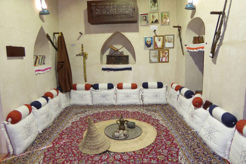 Die Nacht war so ruhig und erholsam, dass ich wie ein Bär geschlafen habe. Keine Meeresbrandung, kein Wind, keine Fahrzeuge die hin und her fahren, einfach Stille. Morgens lassen sich alle Zeit. Wir fahren aber noch einmal ein Stück zurück zu dem Museum das wir gestern nicht angesehen haben und haben die richtige Entscheidung getroffen. Das Museum ist ein großes Wohnhaus mit Park eines früheren Sultans und Verwandten des heutigen Sultans. Wir sind die einzigen Besucher und bekommen eine private Führung. Alle Räume werden uns geöffnet und wir können uns die früheren Empfangsräume, den Wohnraum der Familie, die privaten Räume der 2 Frauen, der Jungen und Mädchen, das Babyzimmer, Ankleide- und Vorratsräume, die Küche und den Pferdestall mit einem künstlichen Pferd ansehen. Auch eine Bibliothek und Gästeräume gehören dazu. Errichtet wurde das Haus im 19. Jh. Heute gibt es hier auch ein Restaurant für größere Gesellschaften oder Feiern bzw. für Schulklassen. Die 7.50 € war der Eintritt wert. Am Ende haben wir noch einen omanischen Kaffee mit Kardamom und Safran bekommen, dazu konnten wir uns aus einer Schale mit Datteln bedienen.