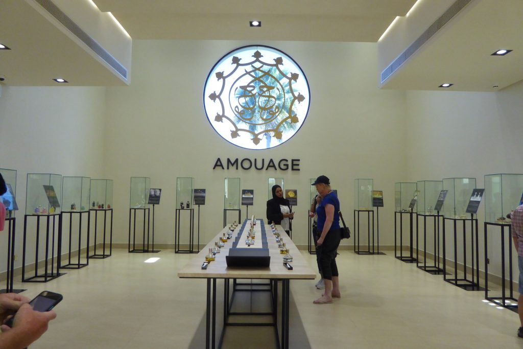 Morgens sehen die Berge ringsherum noch beeindruckender aus. Dann verlassen wir das schöne Wadi und fahren ein Stück auf der Strecke zurück und dann nach Barka zurück, wo wir an der Wassertankstelle noch Wasser auffüllen, das hier sehr sauber ist und einen starken Druck hat. Leider stehen schon zwei große Fahrzeuge von uns hier die so um die 200 Liter jeweils bunkern und wir nehmen den kleinen Hahn und füllen mit Gießkanne und 5 l Wasserflaschen unseren Tank voll. Das dauert natürlich entsprechend lange aber bei uns passen auch nur 100 l in den Tank und der ist noch halb voll. Dann geht es weiter Richtung Muscat und um 12 Uhr haben wir uns an der Parfümfabrik Amouage verabredet, wo diejenigen die es interessiert eine Führung bekommen. Amouage ist eines der teuersten Parfüms der Welt. Allerdings hat bisher keiner von uns vorher etwas davon gehört. Wir bekommen die teuren Flakons gezeigt, die der Sultan Qaboos selbst in Auftrag gegeben hat und an spezielle Gäste verschenkt. Die Herstellung und Mixtur wird von Hand gefertigt, auch die Abfüllung. Über 50 verschiedene Duftrichtungen werden hier hergestellt durch Dampfdestillation bzw. Ölmazeration.  Wir konnten einige Düfte ausprobieren. Ich habe auch einen sehr angenehmen Duft für mich gefunden. Allerdings sollte das Fläschchen 475 € kosten und ich habe mich dann doch anders entschieden und darauf verzichtet. Gekauft hat niemand, sogar die Dame die uns geführt hat erzählte, dass sie sich die Parfüms nicht leisten könne.