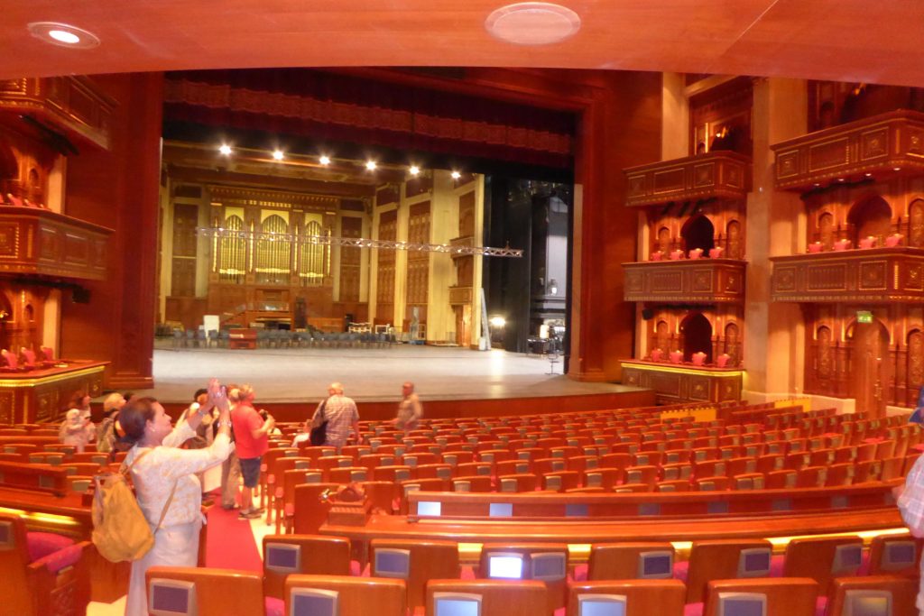 Durch den Park geht es dann wieder zurück zum Bus und wir fahren zum königlichen Opernhaus das 2016 eröffnet wurde. Von außen ist es schneeweiß, im Inneren ist braun die dominierende Farbe. Viele Holzschnitzereien sind schon im Foyer zu sehen, auch ein großer runder Tisch mit Intarsien Arbeiten. Der Innenraum mit den vielen Rängen und Balkonen ist holzgeschnitzt und hinter der Bühne prangt eine große deutsche Orgel. Viele Omanis haben hier Abos für die Vorstellungen um die Oper zu unterstützen, nutzen die Karten aber gar nicht.