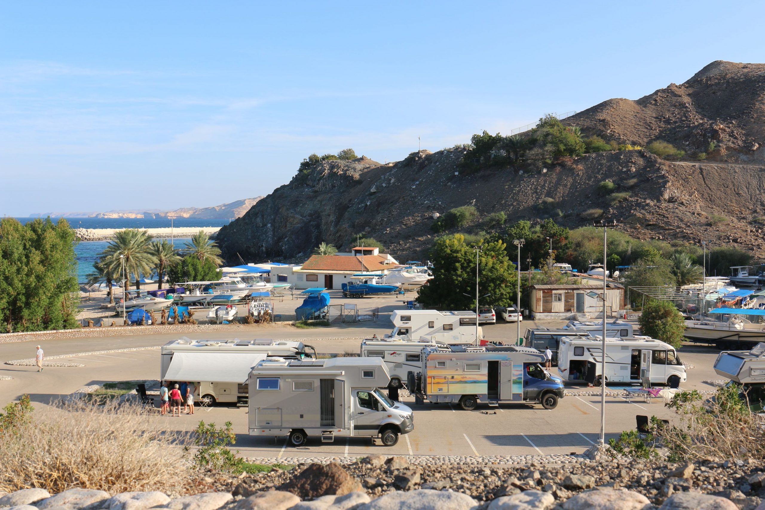Unser Stellplatz für die nächsten 3 Nächte liegt in einem Ortsteil von Muscat im Yachtclub und hat Strom, Duschen, Toiletten und einen Strand (welch Luxus) wo wir wie in Europa im Badeanzug baden können. Hier sind viele ausländische Gäste und somit können wir uns hier frei bewegen. Heute ist es sehr warm aber es gibt auch viele Mücken. Wir kommen erst um 15 Uhr an und müssen erst einmal Mittag essen und sind schon zerstochen. Danach schauen Gerd und Walter bei uns unter der Sitzbank nach, wo das Wasser herkommt. Jeden Tag können wir ein Frotteehandtuch voll Wasser auswringen, das wir dort in eine Ecke drücken, wo es immer nass ist. Wir wissen nicht woher es kommt. Jetzt haben die Beiden einen Schlauch der vom Waschbecken kommt abgenommen und verschlossen und das Waschbecken voll Wasser gefüllt, mal sehen ob morgen früh noch Wasser im Waschbecken ist oder ob es irgendwo undicht ist. Nach dem Meeting bringt Valery die gesammelte Wäsche der Fahrzeuge zur Wäscherei und wir verwahren den Schlüssel vom Tor des Yachtclubs, das abends verschlossen wird. Diejenigen von uns die noch irgendwo zum Essen gefahren sind müssen sich dann telefonisch bei uns melden, damit wir ihnen  das Tor aufschließen können. Heute habe ich einen tierischen Muskelkater von den 700 Stufen zu den Terrassengärten.