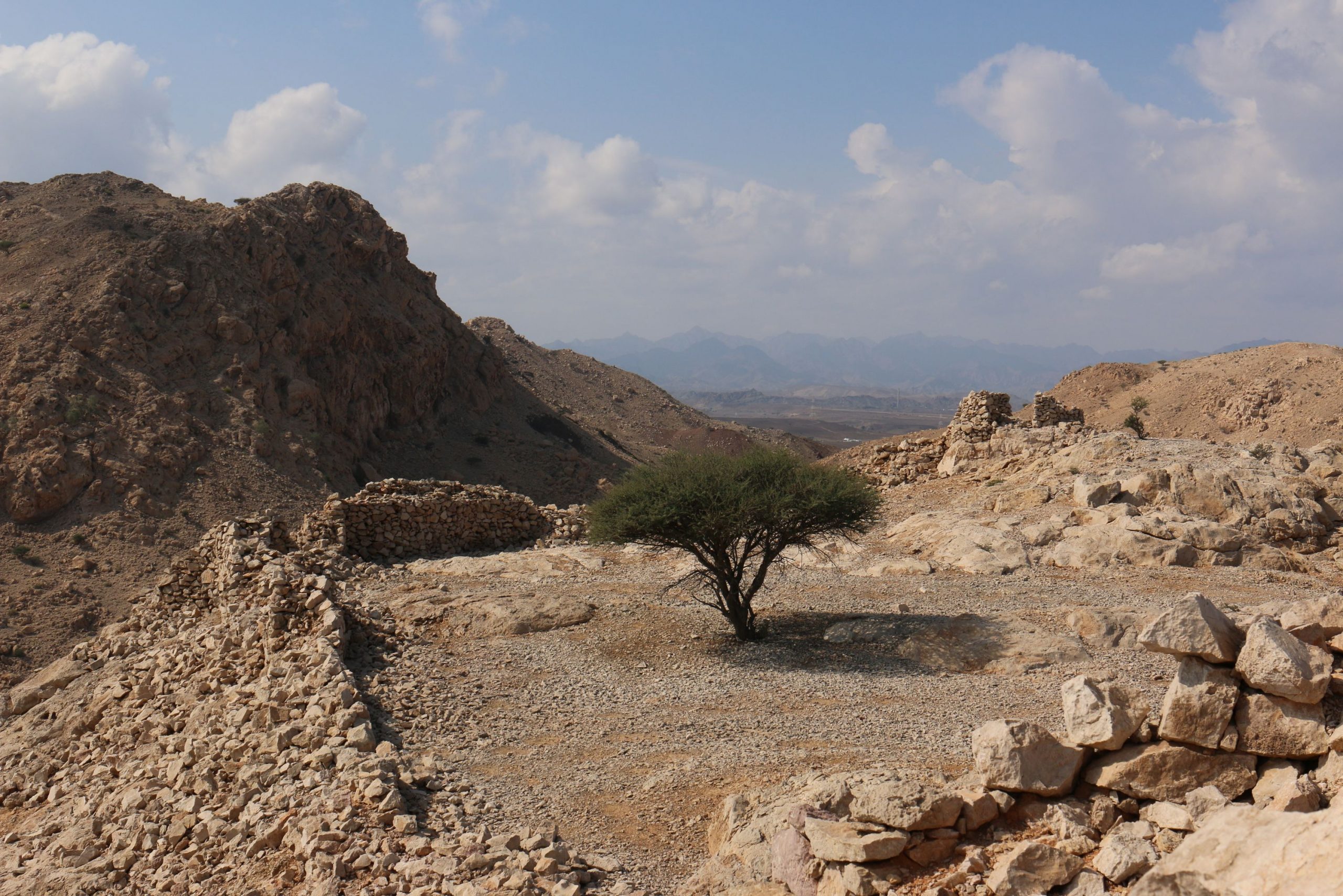 Dann geht es weiter zu einem Gebiet in dem früher Kupfer abgebaut wurde und weiter zu einer Burgruine (Hawra Burghah) was übersetzt heißt: Weißer Kalkstein Garten. Hier wollen wir eine Wanderung machen. Die Wanderung erweist sich allerdings als Klettersteig. Als wir ankommen sind Valery und Silas sowie Lino und Claudia schon dort. Wir ziehen uns unsere Bergstiefel an und los geht es. Alleine hätten wir den Weg niemals gemacht oder gefunden. Es geht über Geröll und hohe Steine den Berg hinauf und um den Berg herum bis wir nach knapp 1 Stunde oben ankommen. Viele Reste einer alten Anlage sind erhalten, auch ein Torbogen und einzelne Wehrtürme. Die Anlage muss riesig gewesen sein und schwer einzunehmen, da von allen Seiten die Felsen steil aufragen. Von oben sehen wir auf unsere Womos herunter und auf die Landschaft ringsherum. Der Abstieg ist schwieriger, denn das Geröll ist manchmal nicht ohne und es gibt nichts zum Festhalten. Dazu stachelige Büsche. Nach knapp 2 Stunden sind wir wieder unten und haben uns unser Mittagessen verdient. In der Zwischenzeit sind Rudi und Uwe auch angekommen. Rudi ist alleine hinaufgestiegen, aber als Schweizer kennt er sich ja in den Bergen aus.