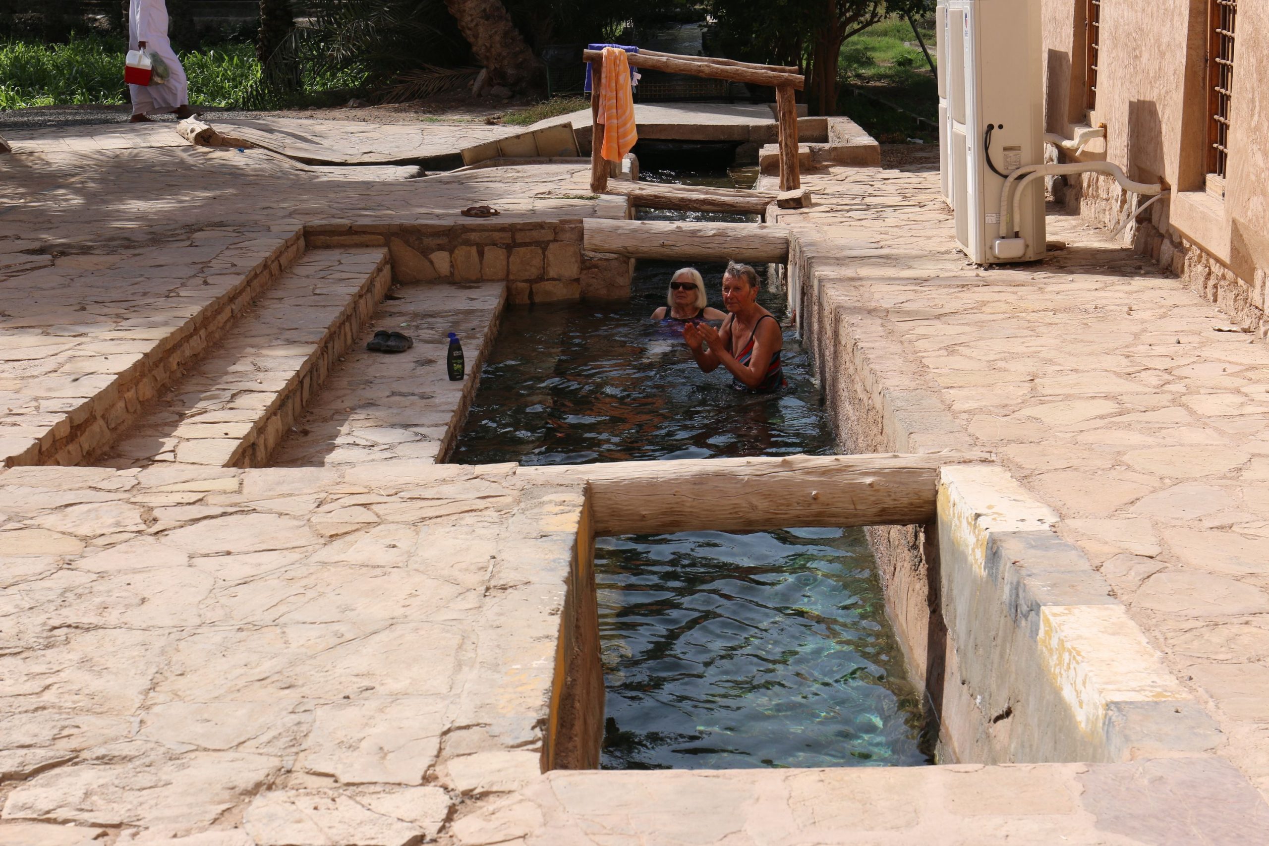Dann geht es wieder zurück und nach Al Hazm wo wir erst die Tankstelle ansteuern und dann das Auto waschen lassen wollen. Aber da heute muslimischer Sonntag ist, sind die Leute an der Waschanlage erst wieder um 16 Uhr zurück. So lange haben wir keine Zeit, also fahren wir weiter zum Stellplatz am Fort und haben einen schönen Platz direkt neben dem Waschhaus der Moschee am Fort. Dahinter Palmen und ein Wasserlauf mit Thermalwasser. Wir stellen unsere Stühle und Tisch vor die Palme und machen Mittag, danach ziehen wir unsere Badesachen an und gehen in das Becken mit dem schönen warmen Wasser, eine Wohltat. Es ist nicht groß und schwimmen kann man auch nicht, aber es fließt beständig und man kann bis zum Hals drin sitzen.