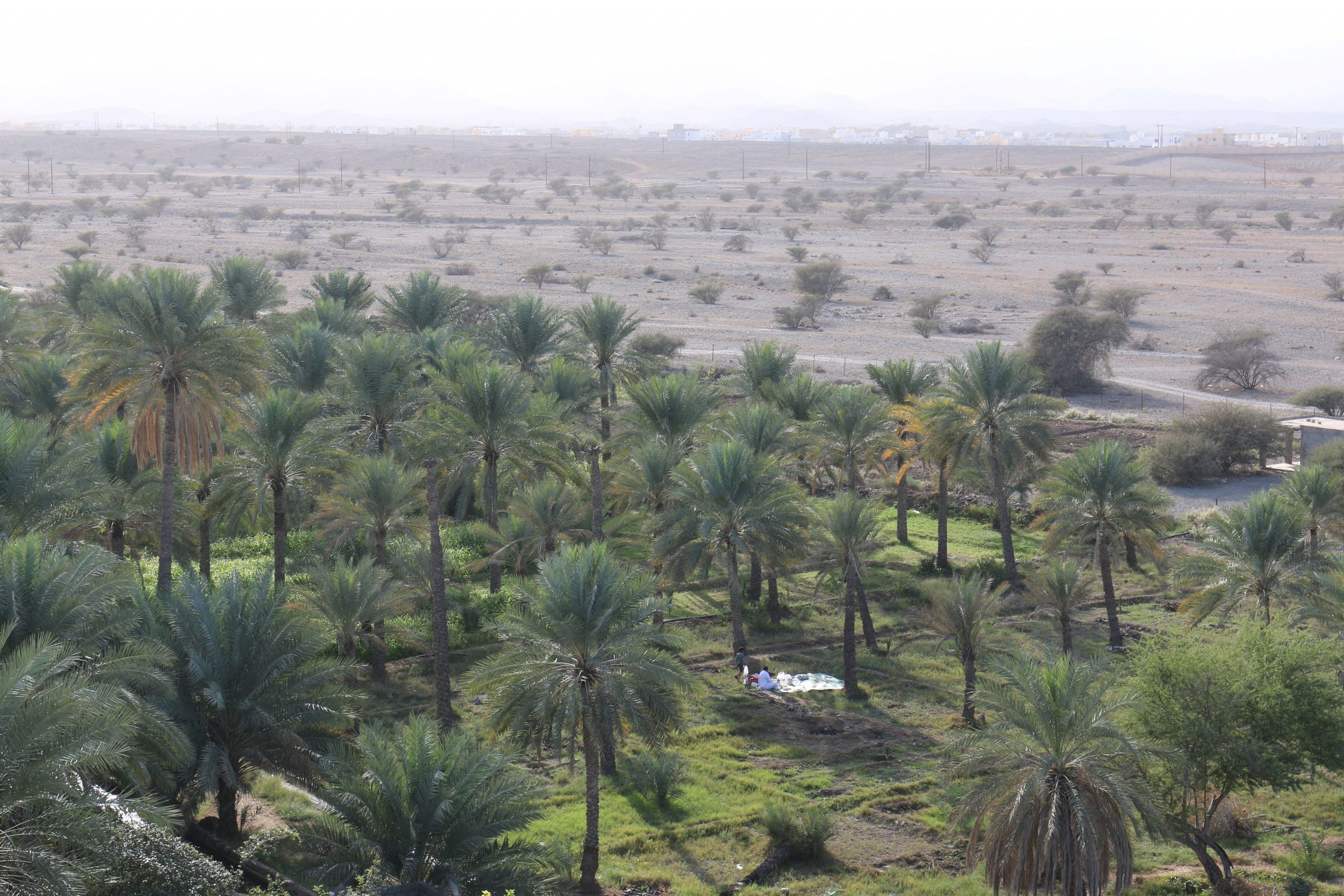 Die Sonne scheint und es ist warm als wir kurz vor 9 Uhr den Platz verlassen und als nächstes die Lagune zur Vogelbeobachtung ansteuern. Es sind aber leider keine Vögel zu sehen. Wir hören sie aber in den Mangroven zwitschern. Dann fahren wir weiter zurück zum großen Liwa Fort, das gerade geöffnet hat und wir durch das niedrige Tor einsteigen können. Im inneren ist ein Mann mit Putzarbeiten beschäftigt und er öffnet uns freundlicher Weise mehrere Türen zu verschiedenen Räumen. Von ganz oben haben wir einen schönen Blick auf die Umgebung mit viel Grün. Die Mauern dieser Wehranlage sind 3 m dick und das Dach ist auf Säulen gebaut und enthält keine Holzstützen.