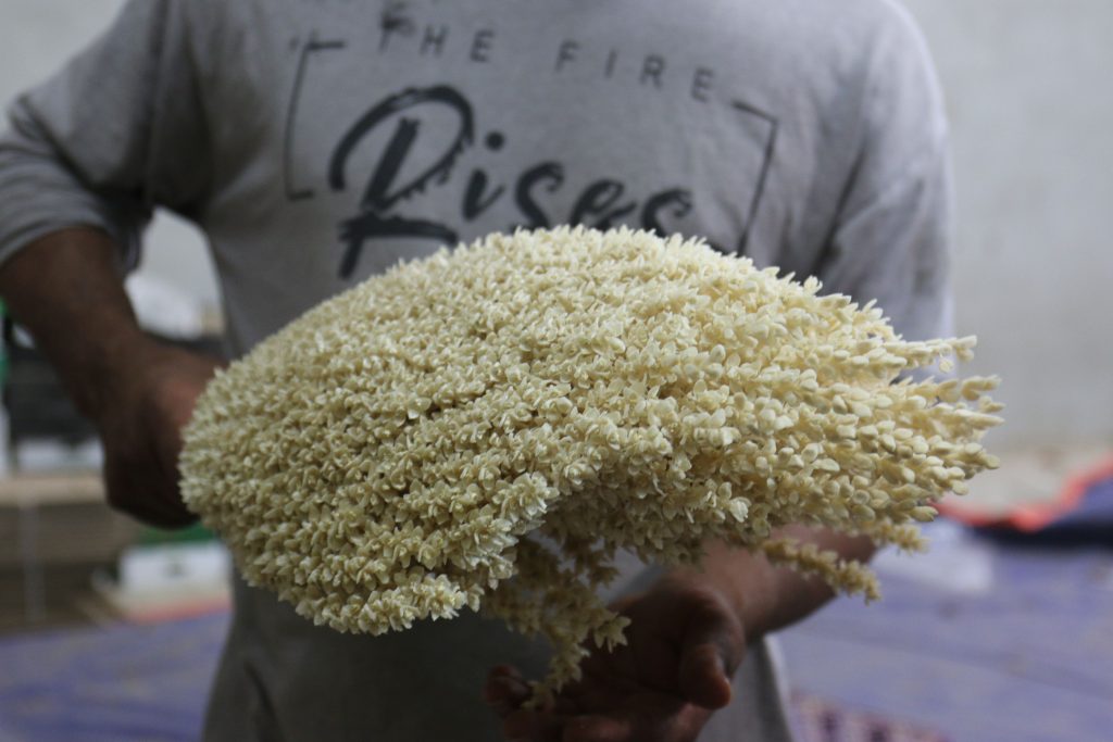 Gegen 17 Uhr kommt Ali endlich an. Er macht mit uns eine Führung über seine Farm wo Alfalfa, Kartoffeln und in erster Linie Datteln angebaut werden. Er hat 350 weibliche Dattelpalmen, die alle einzeln mit männlichen Blüten bestäubt werden. Wir konnten heute einen Arbeiter in den Dattelpalmen beobachten, der in die weiblichen Blüten mit einem Zweig der männlichen Blüten verbunden hat. So kann der Blütenstaub die weiblichen Blüten eher erreichen als wenn sie darauf warten, dass die männlichen Bäume den Blütenstaub übertragen und der Ertrag ist so größer. Pro Palme kann mit einem Ertrag von 120 – 150 kg Datteln gerechnet werden. Erntezeit ist September bis November. Einer der Arbeiter bringt eine männliche Blütenrispe die eingefroren worden sind, um sie zu gegebener Zeit zu verwenden.