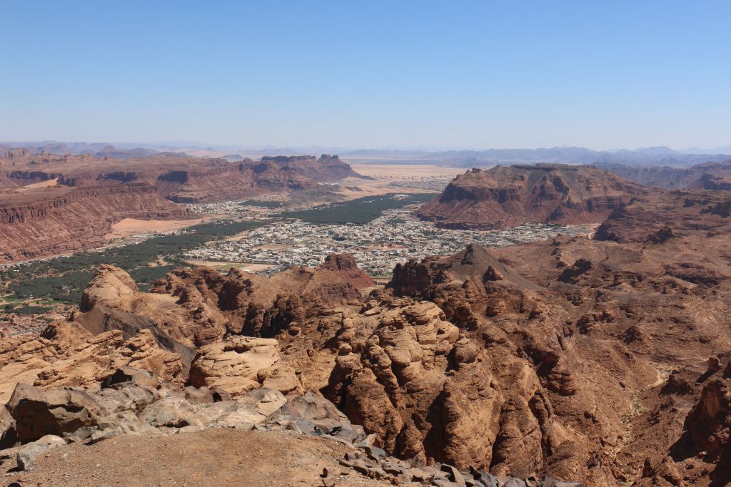 Morgens 10°. Wir haben wieder Warmwasser und Heizung in Betrieb genommen. Aber die Sonne scheint und so hoffen wir, dass es allmählich wärmer wird. Streckenweise sehen wir anfangs noch viel grün auf dem roten Wüstenboden, später wird es wieder trockner. Die Landschaft verändert sich von flach zu hügelig und später zu schroffen Felsen. Wobei man sagen muss, es wird immer eindrucksvoller. Die Oase Al Ula liegt in einem Tal, dass von steilen und schroffen Felsen umgeben ist. Es sieht fantastisch aus, wenn man in das Tal hineinfährt, aber von oben, von dem Viewpoint, ist die Aussicht atemberaubend. Wir haben diesen Punkt gleich bei der Anfahrt angesteuert und sind begeistert.