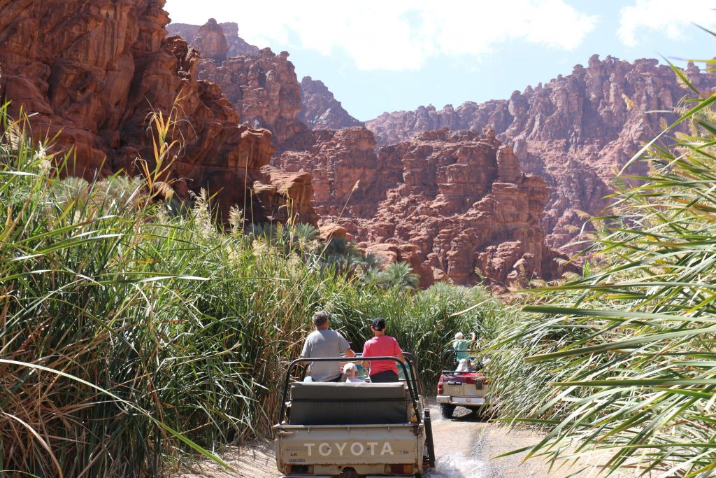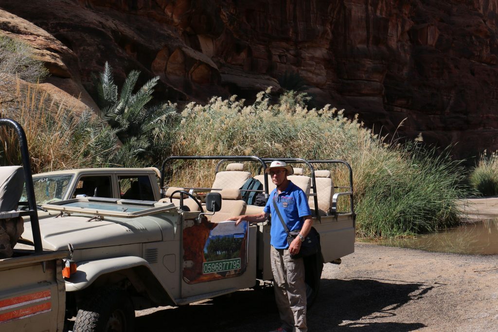 Die Felsen rechts und links sind wunderschön und man könnte hunderte von Bildern machen und jedes sieht anders aus. Einmal müssen wir halten, weil ein Jeep der aber nicht zu uns gehört, mit einer Reifenpanne vor uns festliegt. Einen Wagenheber gibt es nicht und so haben die Saudis einen dicken Stein untergelegt, um den Wagen zu stabilisieren. Für den neuen Reifen schaben sie mit dem Radschlüssel ein Loch, damit der Ersatzreifen auf die Achse geschoben werden kann. Nach kurzer Zeit ist der Schaden behoben und es geht weiter. Auf der ganzen Strecke durchs Wadi fahren wir im Wasserlauf mit mal mehr, mal weniger Wasser und je tiefer die Wasserlöcher, umso mehr Spaß haben wir. Nach 3 Stunden sind wir zurück auf der Farm mit tollen Eindrücken und alle sagen, es hat sich gelohnt (ca. 25€ pro Person).