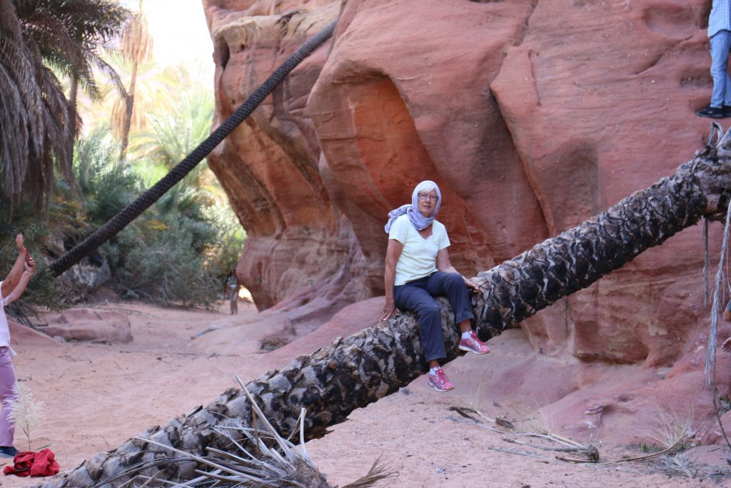 Wir fahren noch ein Stück dieser Uferstraße bis Maqna, wo wir uns im Ort die 12 Mosesquellen ansehen. Hier hat Moses nach seiner Flucht aus Ägypten seinen Stab in die Erde gesteckt, wo die Mosesquellen entspringen. Wir treffen hier eine Familie aus Indien, die an den heiligen Quellen Heilung und Gesundheit erhoffen. Sie trinken es und waschen sich damit Gesicht und schmerzende Körperteile. Die kleinen Quellen sprudeln direkt aus dem Boden und das Wasser läuft in einen Bachlauf mit Brücken und ist von Palmen umstanden.