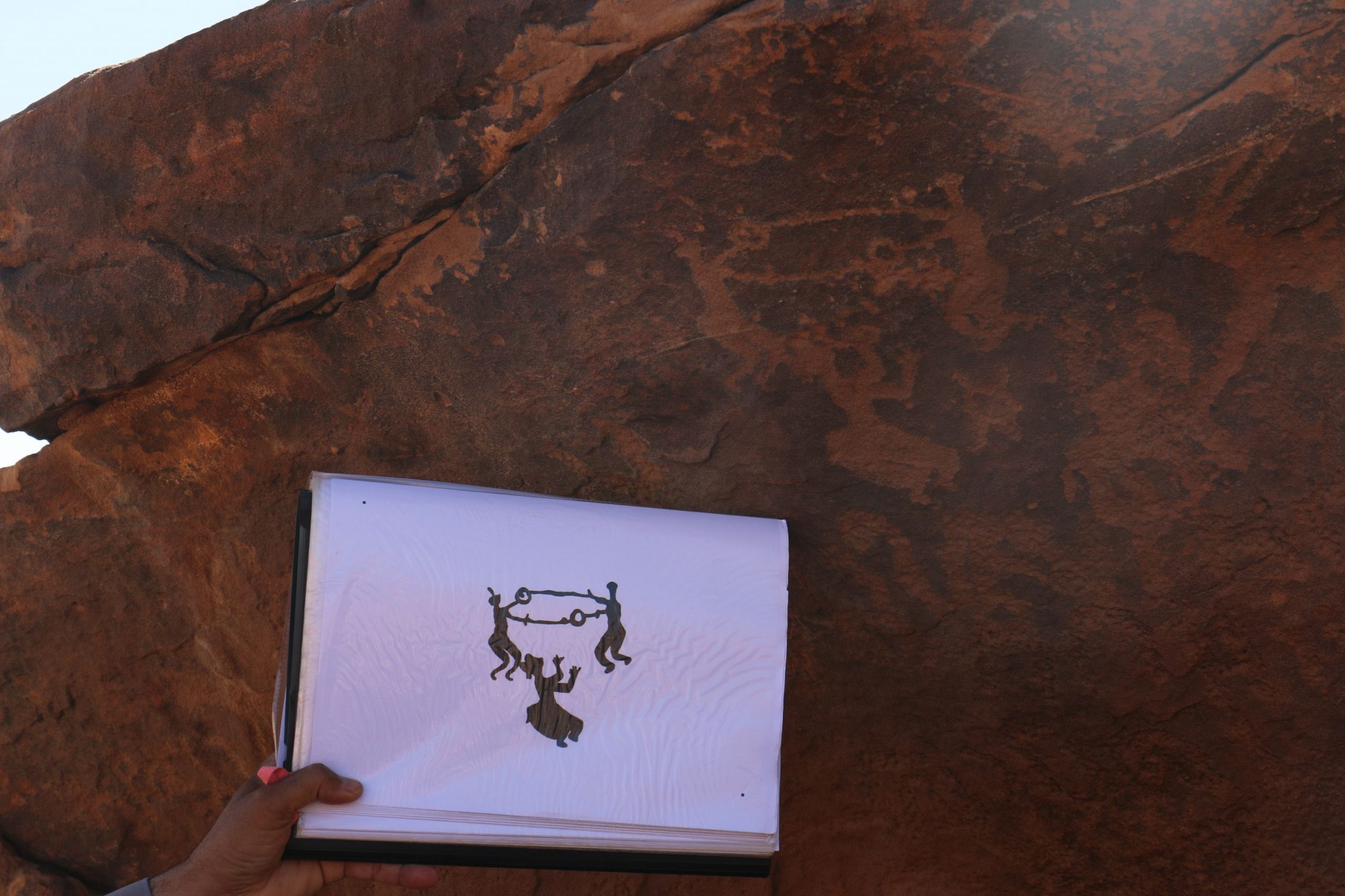 Es geht gut 2 ½ Stunden durch die wirklich beeindruckende Anlage und unser Guide zeigt uns in seiner Mappe die rekonstruierten Bilder als schwarz/weiß Kopie, so dass wir sie teils besser nachvollziehen können. Zum Schluss macht er noch ein Gruppenfoto von uns vor den Felsen. Die Landschaft ist auch ohne die Felszeichnungen traumhaft schön und man könnte sie fast mit dem Monument Valley in Kalifornien vergleichen.