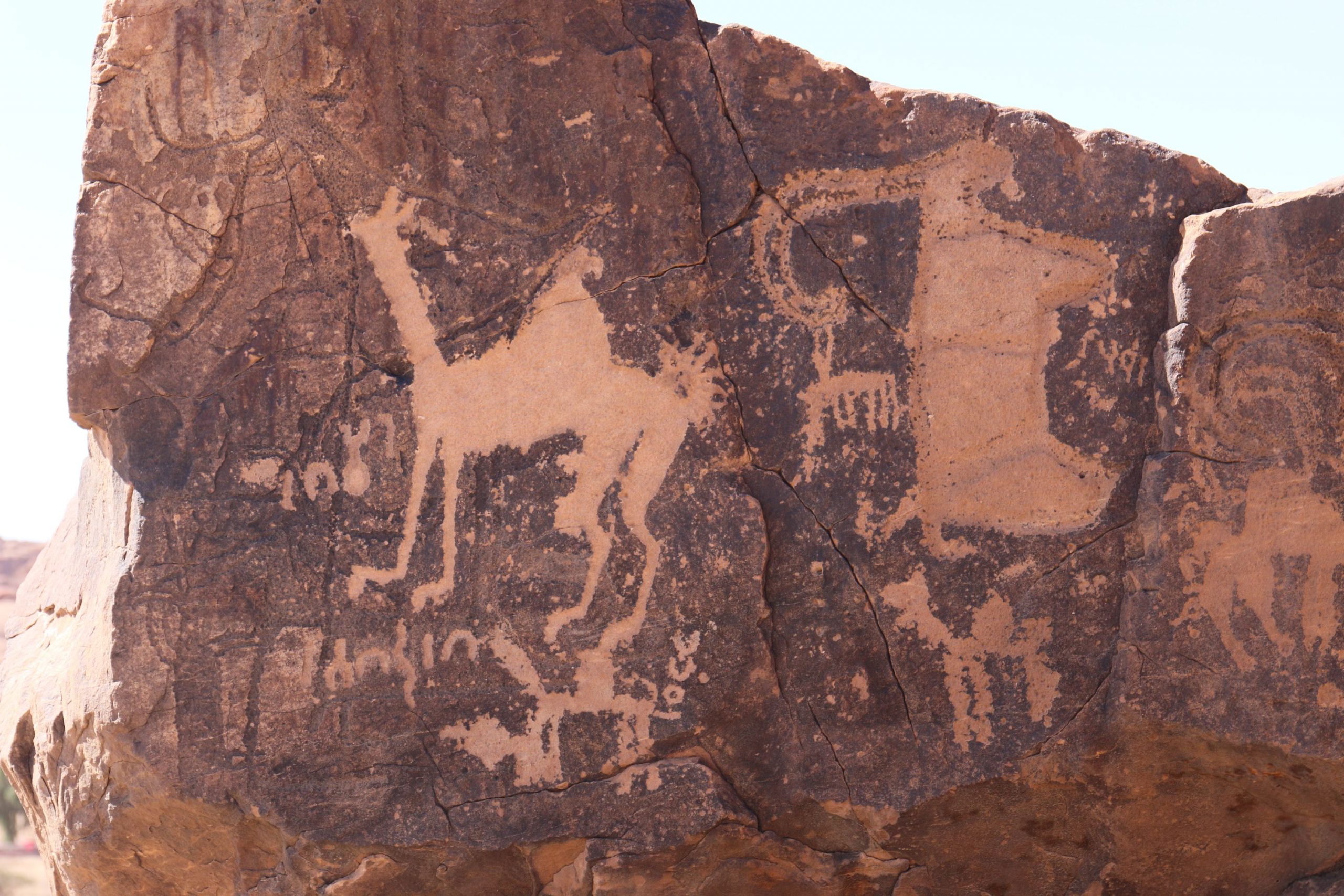 Anscheinend müssen wir uns wieder auf niedrigere Temperaturen einstellen. Nachts hatten wir nur 11° und morgens auch noch, dazu ein frischer kalter Wind der uns um die Nase weht, als wir unsere Besichtigungstour durch die Felsenlandschaft am riesigen Park der Felsgravuren beginnen. Unser Guide führt uns über Felsen, Treppen und lange Wege und zeigt uns die gut erhaltenen Felszeichnungen aus verschiedenen Epochen. Die ältesten dieser Art (bis 10.000 v. Chr.) sind tiefer eingeritzt und meist größer und von der Farbe dunkler da zu der Zeit dieses Tal üppig bewachsen war und die Menschen gesunde Lebensmittel hatten. Die Feuchtigkeit schlug sich auf den Steinen nieder und der Stein dunkelte nach. Die neueren Felszeichnungen sind aus der thamudischen Zeit (vor ca. 3.000 Jahren) und sind heller. Zu der Zeit war hier alles schon Wüste und trocken.