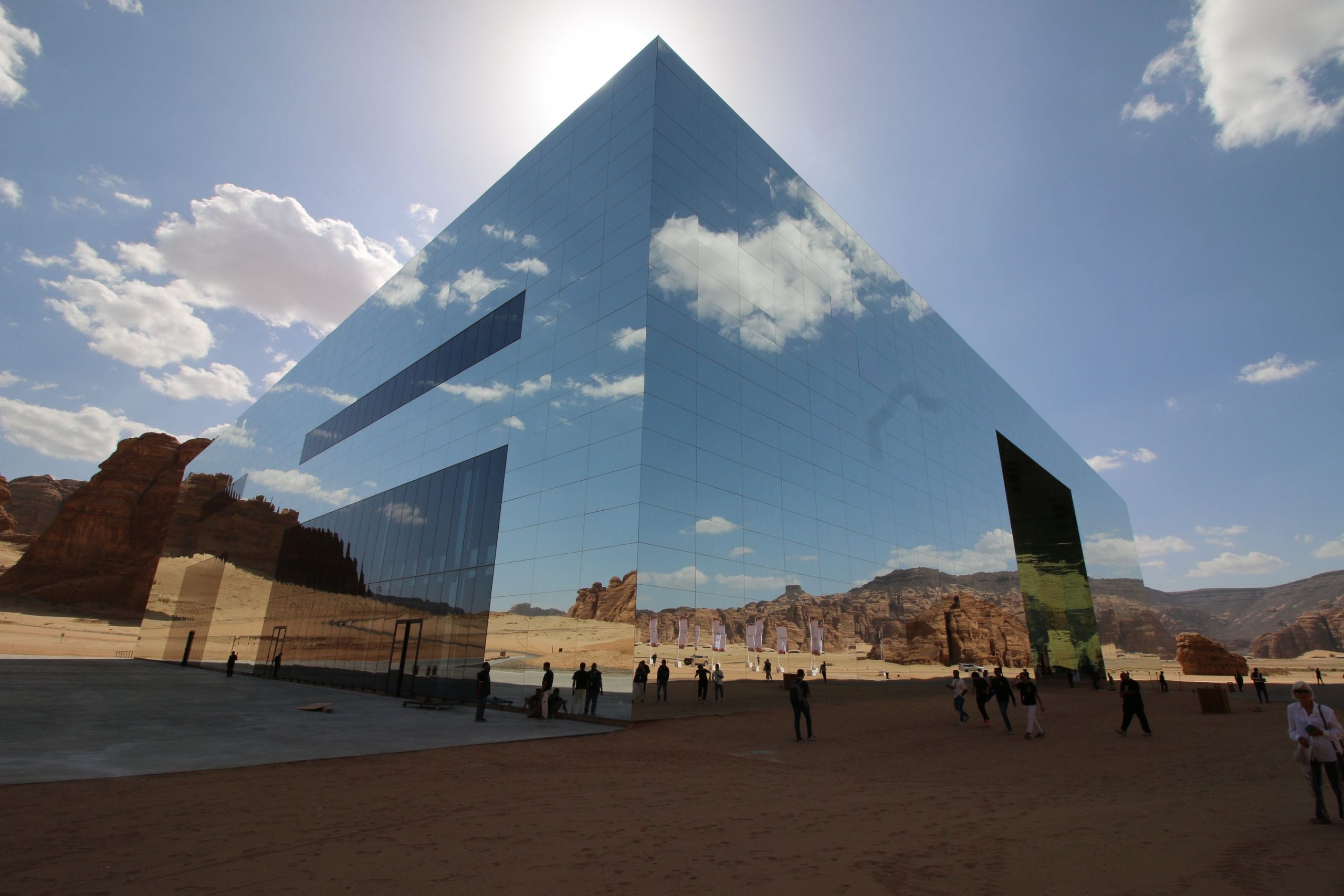 Am späten Vormittag fahren wir von der Farm in die Stadt und sehen uns den alten Stadtkern Dadan an mit den Palmengärten. Von den Häusern stehen nur noch Reste der Lehmmauern. Für das Infozentrum braucht man eine Reservierung. Obwohl kein Mensch weiter drin ist, können wir nicht bleiben, weil wir keine Reservierung haben. Es gibt auch keine Stadtpläne oder Infobroschüren über lohnende Besichtigungen. Alles läuft nur übers Handy. Wir machen an einer Moschee im Schatten der Bäume Mittag und fahren danach zur Maraya Konzerthall, für die wir eine Besichtigung im Infozentrum bei einer arabischen Dame gebucht haben. Da immer alle einen Schleier tragen, sind sie schwer zu verstehen, wenn sie uns etwas auf Englisch fragen oder sagen und man den Mund nicht sieht. Darum dürfen wir auch die Konzerthall nur von außen besichtigen und nicht hinein, wo gerade eine Ausstellung von Andy Warhol zu sehen ist. Allerdings findet heute ein Treffen der Weltwirtschaftskonferenz oder ähnlich statt und ein Riesenaufgebot an Trommlern, Sängern, Reitern und hinterher an Prominenz steht vor der verspiegelten Halle in der Wüste mit den Bergen ringsherum. Das muss man gesehen haben. Wenn man auf die Halle zufährt, sieht man das Auto sich in der Fassade spiegeln und dazu die Kulisse der Berge. Manchmal sieht man nicht, wo die Halle endet, so verbindet sie sich mit der Umgebung. Wir stellen das Auto auf dem Parkplatz ab und gehen ringsherum und immer wieder ist die Aussicht faszinierend. Der Eingang selbst ist etwas nach innen versetzt und spiegelt sich noch mehrmals in der Seite. Vor dem Eingang haben sich die Trommler und Tänzer positioniert und davor die Reiter, alle in schöner Tracht.