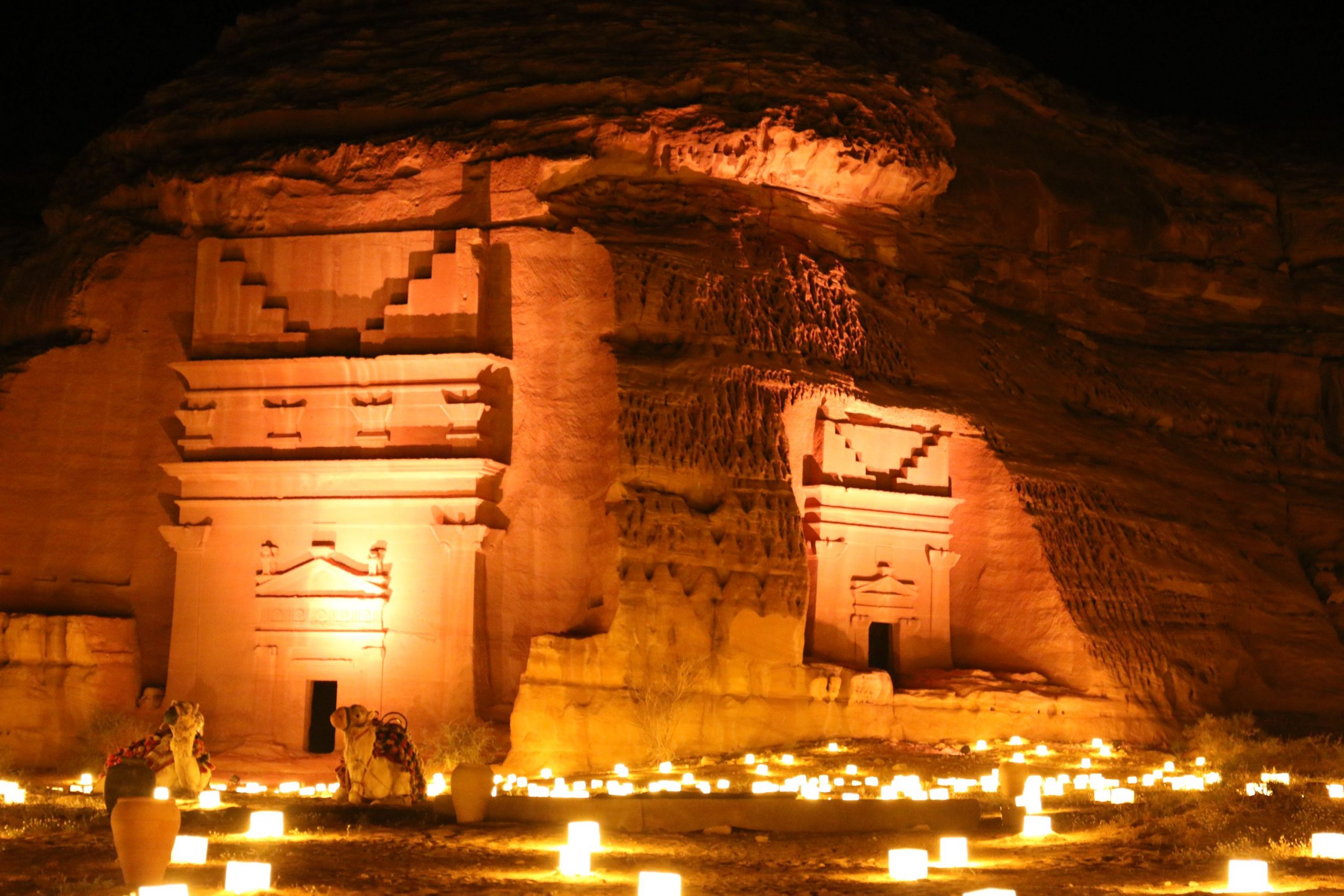 Dort steigen wir aus und werden von Frauen in der Tracht der Nabatäer empfangen. Weihrauchgeruch hängt in der Luft und ein paar Männer laufen mit den Weihrauchbrennern durch das Gelände das mit kleinen Tischchen und Sitzkissen ausgestattet ist. Die Felsengräber sind angestrahlt und es ertönt arabische Musik und später wird die Geschichte von Hegra erzählt. Wir bekommen ein paar kleine Happen Käse, Gurke und Datteln und ein Getränk serviert und lauschen den Klängen. Nach kurzer Zeit wird zum Aufbruch gerufen und wir steigen wieder in die Kutschen und werden zum Ausgangspunkt zurück gefahren. Hier geht es wieder in den Bus, der uns zum Winterparkplatz zurückfährt. Die Veranstaltung hat uns gut gefallen und war so ganz anders als bei Tag. Um 21 Uhr sind wir zurück und steigen in unsere Womos. Da wir im Dunkeln nicht noch fahren wollen hoffen wir, hier stehen bleiben zu können. Außer den Eventbussen ist der Parkplatz leer. Das waren 3 sehr schöne Tage in Al Ula die allen großartig gefallen haben und bisher das Schönste von Saudi Arabien gezeigt haben. Aber die Gegend hier ist auch einfach umwerfend schön.