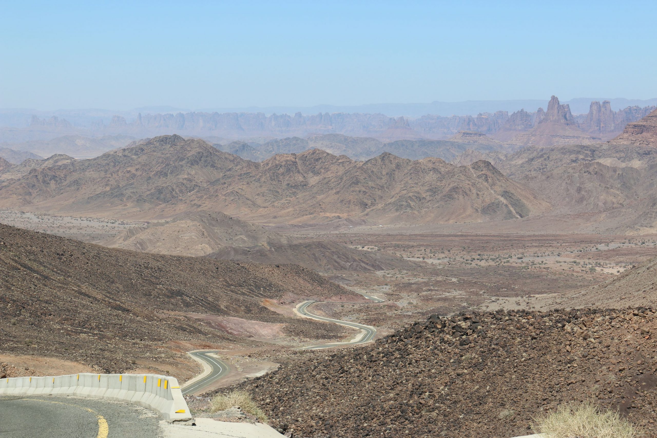 Heute verlassen wir die schöne Gegend von Al Ula und es geht ins nächste Wadi. Die Strecke ist anfangs zum Abgewöhnen. Ein Schlagloch am anderen, Spurrillen, Verwerfungen und wieder Schlaglöcher. Zum Teil konnten wir nur 30 km/h fahren und das über 60 km. Die Felsen werden kleiner und später nur noch Stein- und Geröllwüste, danach wieder hohe Felsen und weißer Sand, später Dünen. Am Ende werden die Berge wieder riesig und wir haben einen schönen Blick auf die Berge als wir die Serpentinenstrecke herunter fahren.