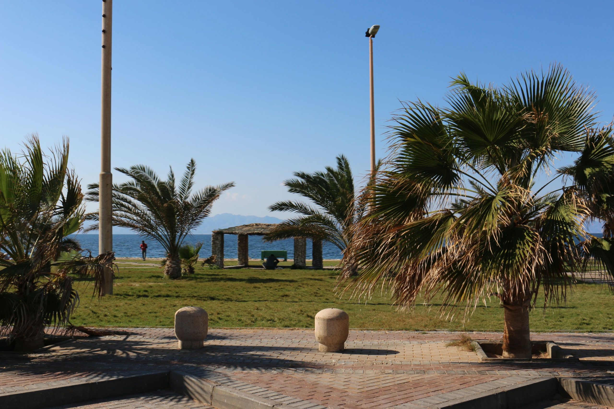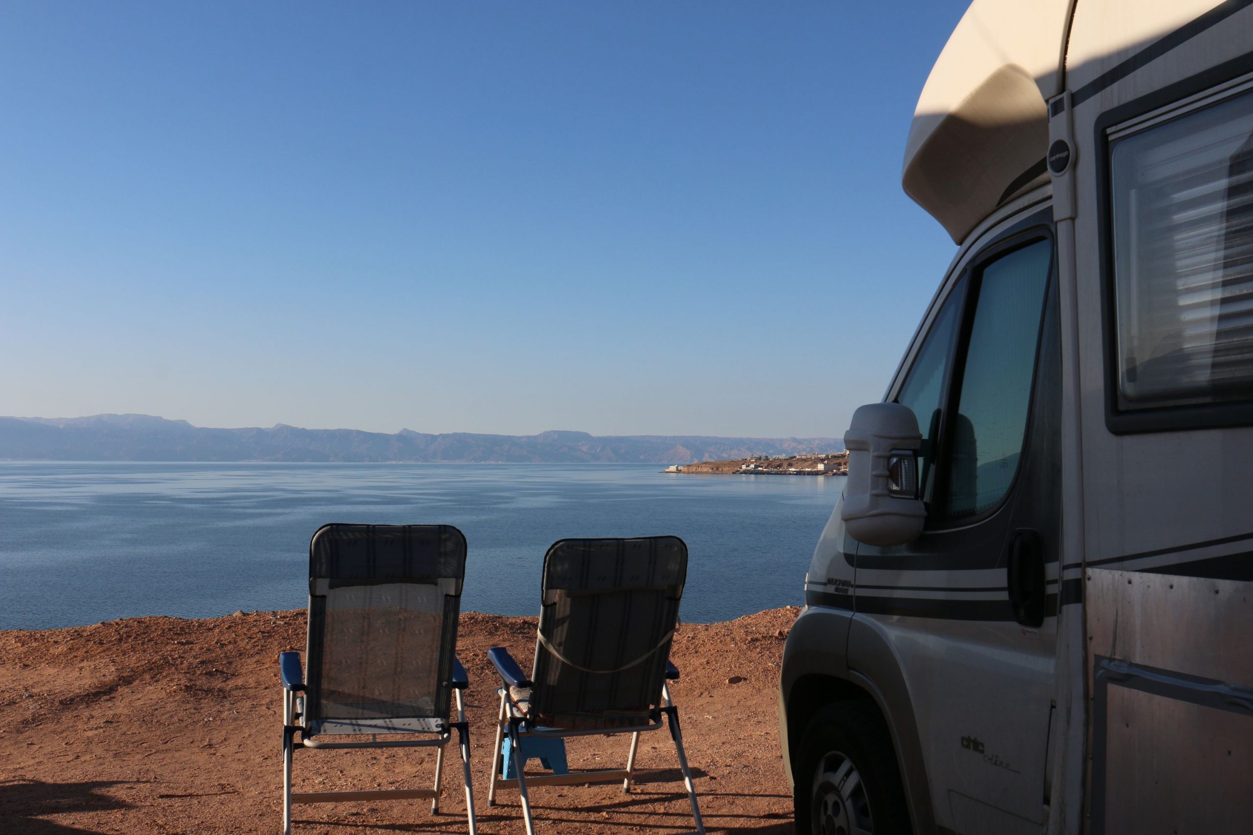 Unser Stellplatz liegt auf einer Anhöhe in Haql und wir blicken direkt auf das Rote Meer und sehen auf der anderen Seite die Berge Ägyptens und 2 kleine Buchten mit Häusern.
