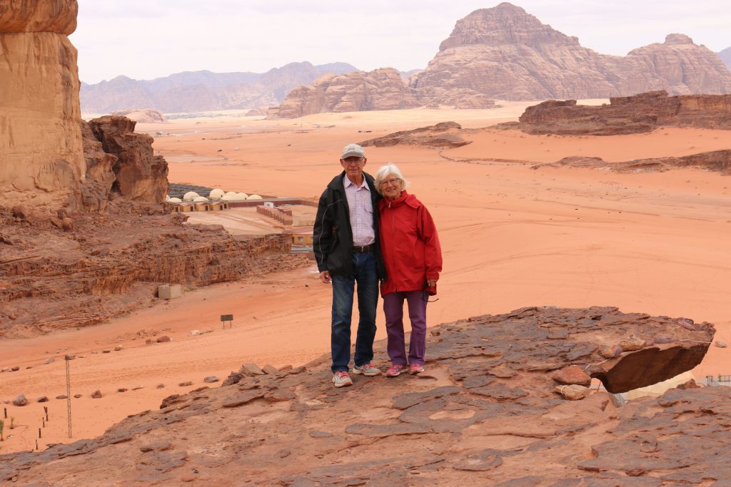 Dann geht es auf ins Wadi Rum. Auf dem Weg besichtigen wir noch eine alte Dampflock die 1907 erbaut wurde, die Waggons sind noch älter und aus dem Jahre 1903. Die Bahnstrecke verbindet Aqaba mit Wadi Rum. Kurz nach 14 Uhr erreichen wir unser Wüstencamp Hillawi wo wir 2 Nächte stehen. An die 100 hausähnlicher Wohnzelte sind hier zu mieten. Die Einrichtungen sind von spartanisch bis einfach. Es gibt ein großes Restaurantzelt wo wir heute Abend ein landestypisches Gruppenessen einnehmen das in der Erde auf heißen Steinen gebacken wird. Aber jetzt haben wir erst einmal alle warmen Sachen aus der Heckgarage wieder ins Womo getragen. Hier ist es lausig kalt bei 13° und ein eisiger Wind. Nachts soll es um die 0° werden.