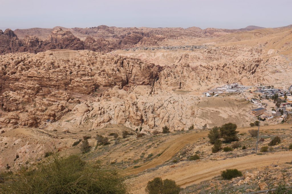 An mehreren Aussichtspunkten halten wir, um die schöne Landschaft zu bewundern. Dann werden die Felsen wieder mehr und vor Wadi Musa sehen wir von oben auf die Felsenlandschaft Petra.