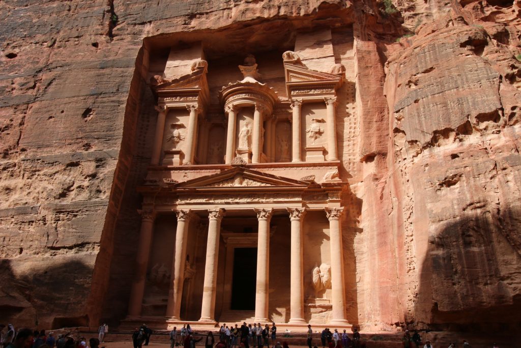 Schon hier sind Relikte der Könige, die Wasserleitungen und Brunnen zu sehen. Dann wird der Blick auf das Schatzhaus am Ende frei und die Sonne scheint auf das Gebäude. Dieser imposante Bau ist das 1. Highlight, das man nach dem Siq erblickt. Es ist fast 40 m hoch und reich dekoriert mit korinthischen Kapitälen, Friesen und Reliefs. Es wurde vermutlich im 1. Jh. vor Chr. erbaut. Davor auf dem Platz liegen diverse Kamele und die Kamelhalter versuchen Leute zum Reiten zu werben. Wir gehen die Fassadenstraße weiter mit den nabatäischen Gräbern die direkt in die Felsen gemeißelt wurden. Die Fassaden sind von Pfeilern, Stufen und Halbkreisen gekrönt.