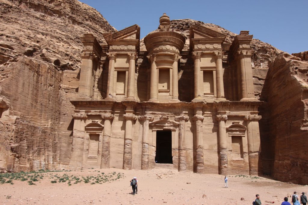 Dann ist es 13 Uhr und die offizielle Führung mit Karim endet am Restaurant wo uns frei steht einzukehren oder unser mitgebrachtes Vesperpaket zu verspeisen. Die meisten haben etwas dabei, wir auch und danach steht allen frei, sich selbst anzusehen, was sie möchten. Wir gehen den Ad Deir Klosterweg. Er geht ca. 2 km bergauf auf unebenen und ausgetretenen Stufen und Steinen und 180 m in die Höhe. Immer wieder kommen Eseltreiber mit Personen auf den Tieren, die Besucher den Berg herauf oder herunterbringen und die Tiere rasen in einem Galopp die Stufen herauf oder herunter, dass man oftmals zur Seite springen muss. Ich gehe nur bis zur Hälfte des Weges hinauf und kehre dann um weil es mir zu anstrengend wird, Gerd geht bis zum Kloster, das wirklich beeindruckend ist.