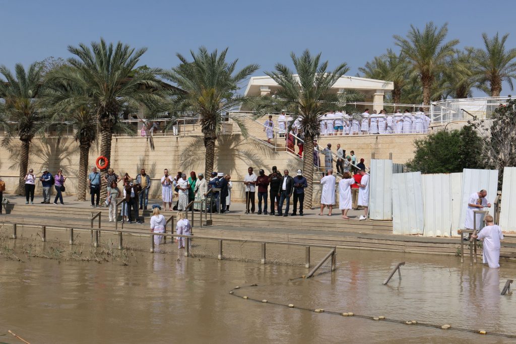 Heute wandeln wir auf Geschichtsspuren. Es geht wieder in vielen Serpentinen den Berg hinunter und am Toten Meer entlang, bis es zu Ende ist. Hier fließt der Jordan ins Tote Meer. Wir fahren zur geschichtsträchtigen Taufstelle Jesu am Jordan – Betanien. Im Visitor Center kaufen wir die Eintrittskarten, hier gilt unser Jordanpass leider nicht. Dann durch das Gebäude und den Garten und in einen Shuttlebus, der uns ca. 4 km zum Jordan hinunter fährt. Mehrere Militärfahrzeuge mit Waffen sind hier postiert. Dann führt uns ein Guide über einzelne Wege erst zur griechisch orthodoxen Kirche die mit schönen Bildern und Ikonen sowie einem hübschen Mosaikboden versehen ist. Von hier gehen Stufen herunter zum Jordan und zur Taufstelle Jesu. Der Jordan bildet die Grenze zwischen Israel und Jordanien. Aber auf beiden Seiten des Flusses sind Möglichkeiten geschaffen, ins Wasser zu kommen. Es geht über Holzstufen und am Geländer entlang ins Wasser und auf Jordanischer Seite kann man bis zu den Knien im Wasser stehen. Auf der israelischen Seite sieht man ganze Gruppen in weißen Gewändern, die ins Wasser gehen und völlig untertauchen und ihre Taufe vollziehen oder wiederholen.