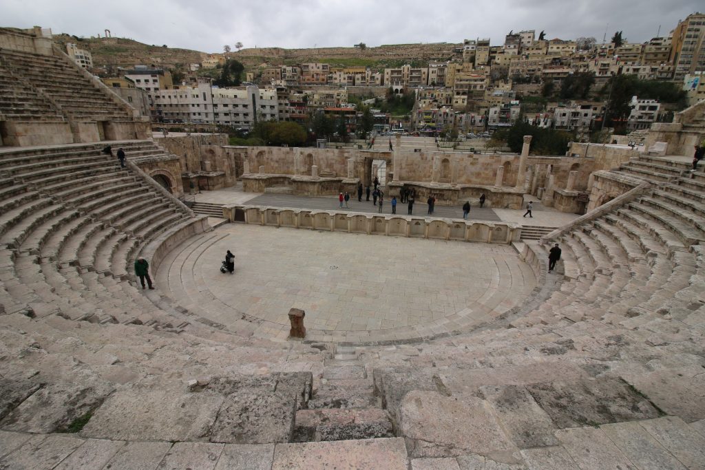 Um 9 Uhr holt uns ein Bus am Platz ab und wir fahren 1 Stunde nach Amman. Amman hat heute 4,5 Mill. Einwohner und ist auf 7 Hügeln erbaut. Es liegt zwischen 750 und 1.100 m hoch. Dort geht es erst zur Zitadelle aus der Zeit um 1.200 v.Chr. der Ammoniter. Es ist lausig kalt und ein scharfer Wind lässt uns trotz warmer Kleidung frieren. Karim führt uns durch die Anlage. Die Wege sind mit Rosmarinbüschen rechts und links bepflanzt. Aus byzantinischer Zeit ist ein Tor noch gut erhalten. Eine in den Felsen gehauene Zisterne versorgte die Garnison mit ausreichend Wasser. Von der einst 13 m hohen Herkulesstatue ist noch der Ellenbogen und ein Teil der Hand übrig. Aus muslimischer Zeit sehen wir in dem Palast El Qasr schöne Arabesken Steinreliefs und eine große Kuppel die später von innen mit einer Holzkonstruktion der Spanier versehen wurde. Vier große Arkaden stützten einst die große Kuppel. Die Aussicht von der Zitadelle auf die Millionenstadt ist unglaublich. Es reiht sich ein Haus an das andere und alle sehen gleich aus. Nach knapp 2 Stunden sitzen wir durchgefroren wieder im Bus und fahren ein kurzes Stück in die Stadt herunter zum Römischen Theater. Es wurde im 2. Jh. n.Chr. halbkreisförmig an den Hügel gebaut und bietet mit seinen 3 Rängen 6.000 Personen Platz.