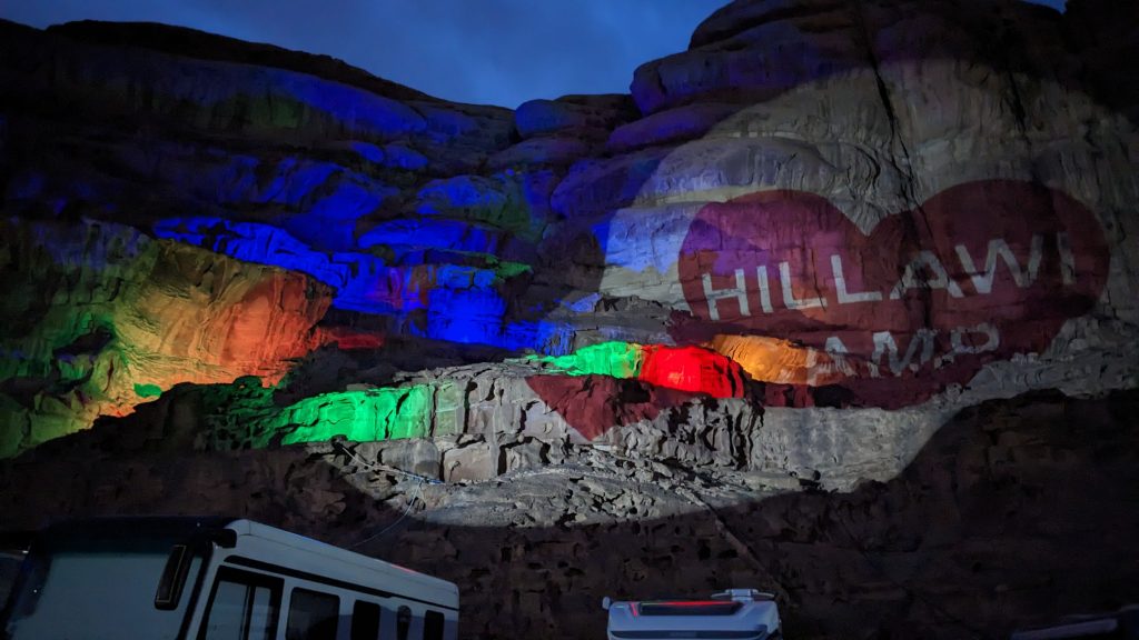Von der Stadt Wadi Musa sind es noch 8 km bis zu unserem Stellplatz am Petra Heritage Village, einem Resort, das noch nicht eröffnet ist. Wir können hier stehen, da wir keine weitere Infrastruktur benötigen. Die Anlage ist an den Berg gebaut und alles gepflastert. Wir stehen ganz oben mit schöner Sicht auf die Umgebung. Abends macht Werner noch ein spontanes Meeting, weil die Führung morgen um einen Tag verschoben wird da es morgen regnen soll. Also wird morgen ein freier Tag für uns sein.