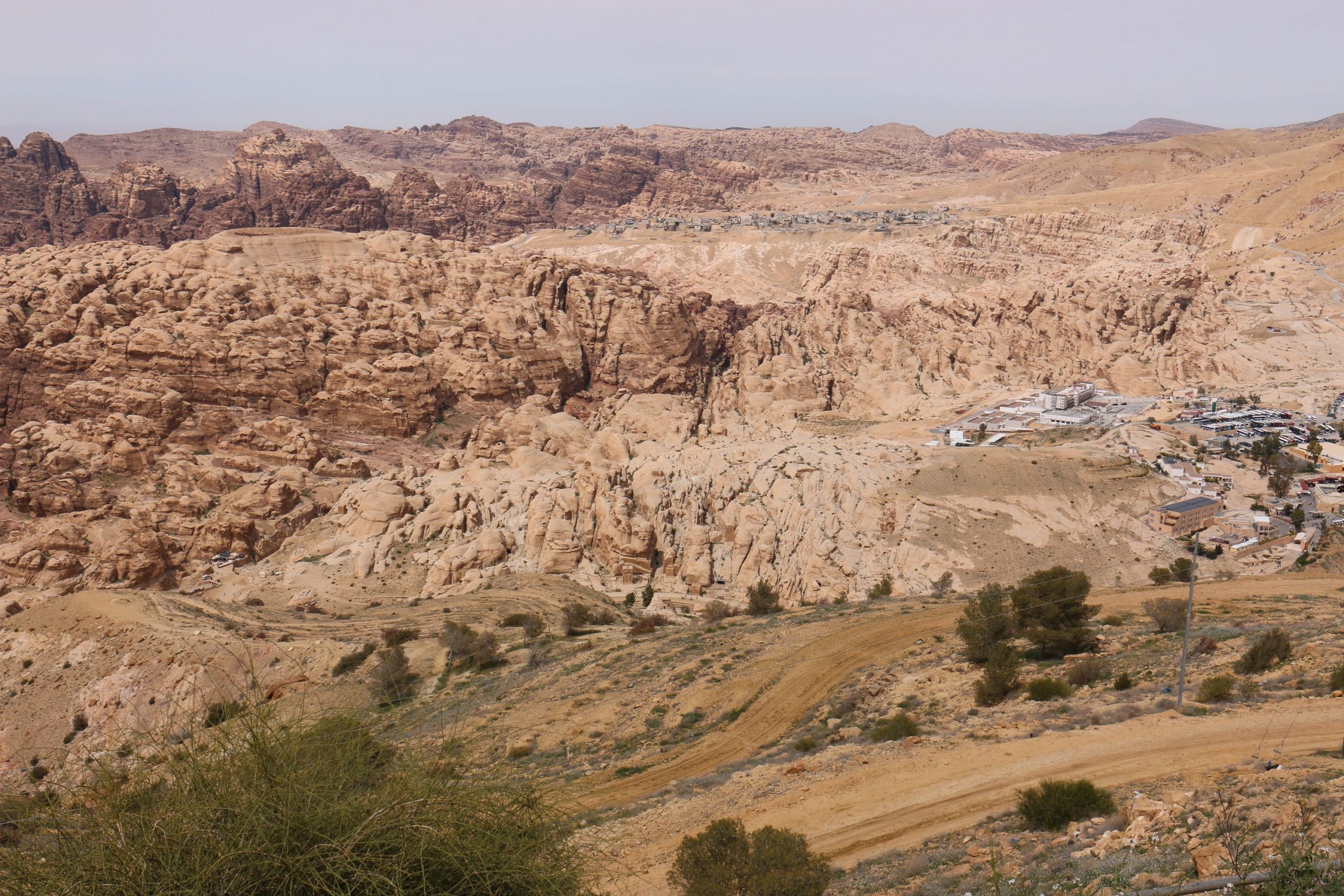 An mehreren Aussichtspunkten halten wir, um die schöne Landschaft zu bewundern. Dann werden die Felsen wieder mehr und vor Wadi Musa sehen wir von oben auf die Felsenlandschaft Petra.
