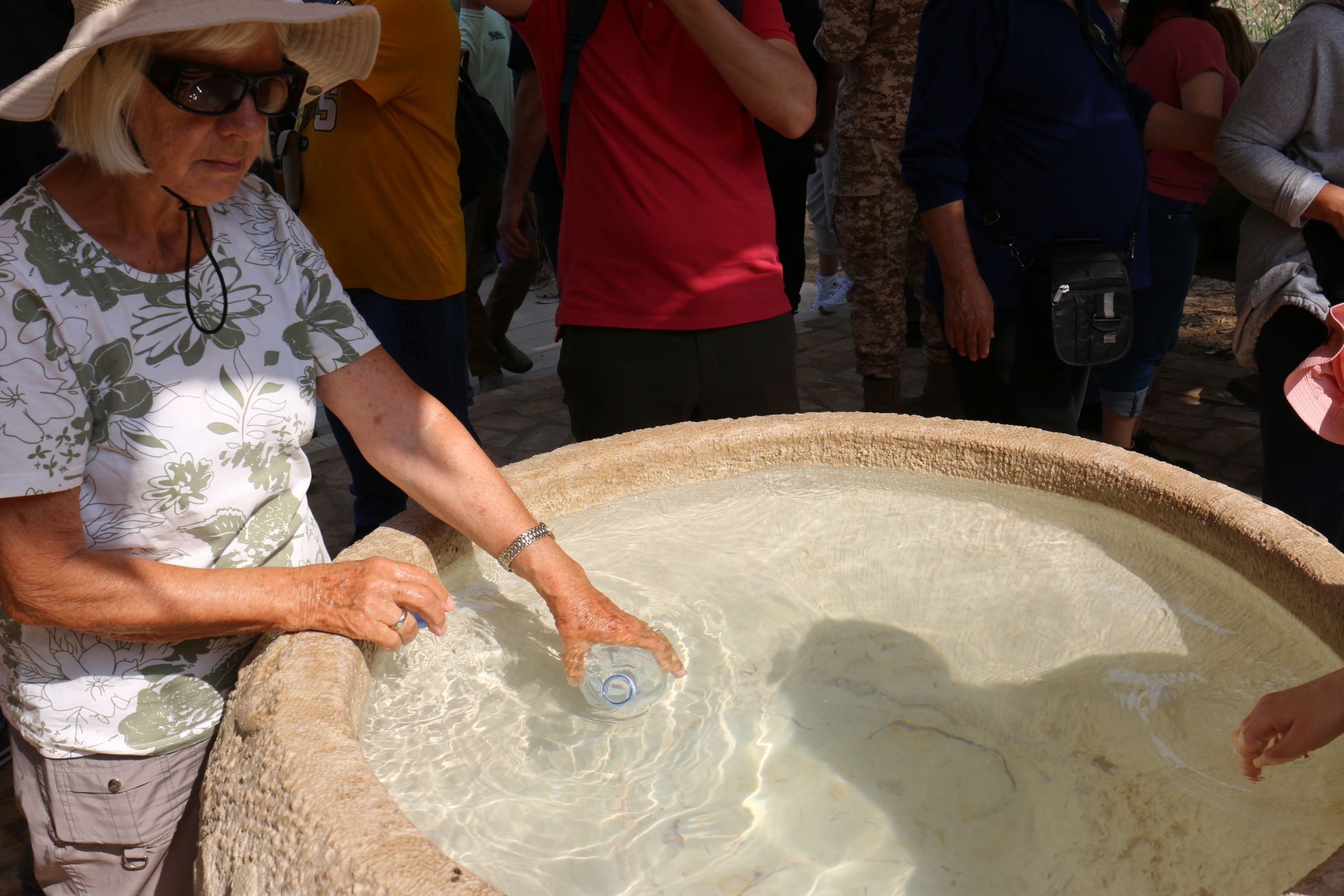 Auf beiden Seiten bewacht Militär das Ganze. Es ist schon ein besonderes Ereignis, an dieser geschichtsträchtigen Stelle zu stehen und ich ziehe meine Schuhe aus und muss einfach auch ins Wasser gehen. Das Wasser ist graubraun vom Schlamm der durch all die Menschen aufgewirbelt wird aber das stört niemanden. Auf der israelischen Seite, wo die Leute ganz untertauchen, wird es sicherlich Duschen geben. Auf einer Seite steht ein großes Steinbecken und hier ist das gefilterte Wasser des Jordans für die Taufe von Babys drin.