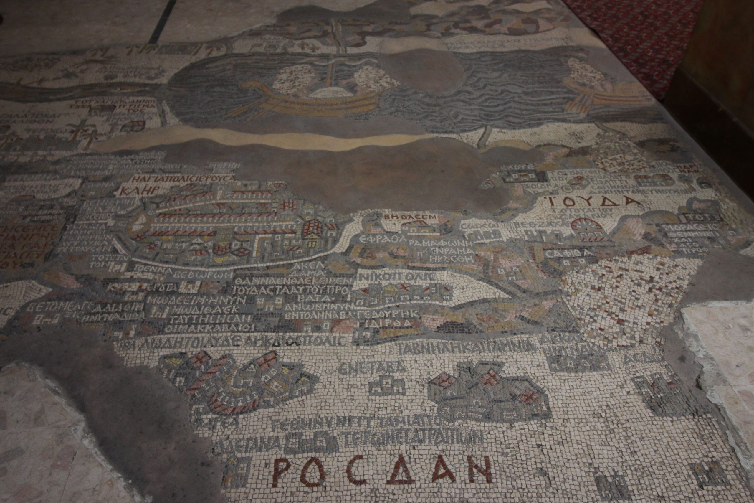 Morgens gibt es einen Stadtrundgang mit Karim. Als erstes besuchen wir die St. Georgskirche direkt neben unserem Stellplatz. Hier befindet sich die weltweit einzigartige Mosaikkarte im Fußboden. Hierbei handelt es sich um eine kartografische Darstellung des Heiligen Landes aus der Mitte des 6. Jh. Leider ist nur noch 1/4 des Mosaiks erhalten. Es zeigt das Tote Meer mit dem Jordanlauf, Jerusalem, Bethlehem, einen Teil von Ägypten, im Norden Karak. Im Jordan sieht man Fische schwimmen. Einer schwimmt vom Toten Meer zurück was darauf hinweist, dass sie im Salzwasser nicht leben können. In dem Mosaik ist die Stadt Jerusalem mit den Stadttoren zu erkennen.