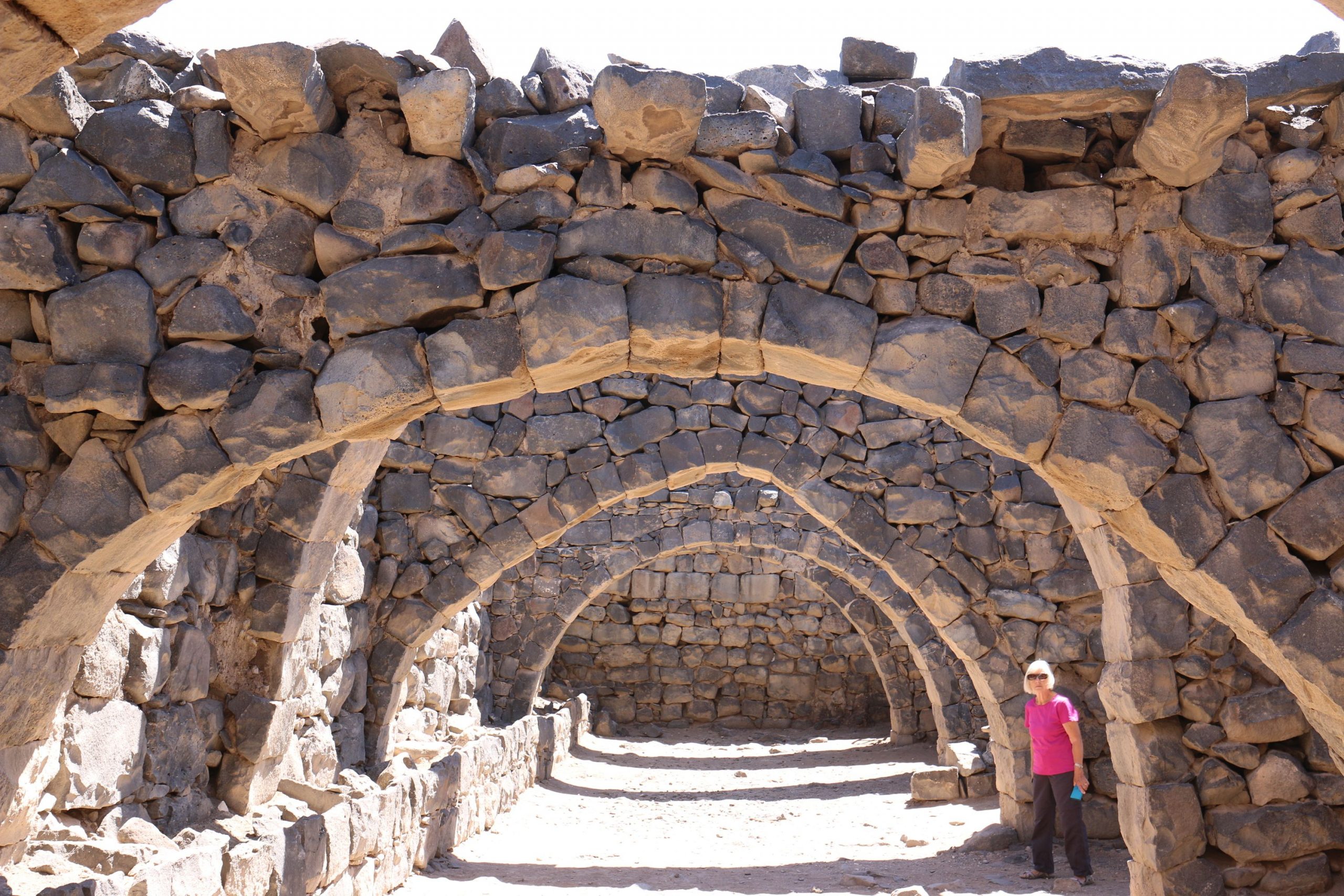 Keiner hat uns verjagt. Aber so ganz ruhig war es auch nicht. Die wilden Hunde haben lange gebellt, die Katzen ständig miaut und von der Straße hörte man die Fahrzeuge. Ich habe schon besser geschlafen. Nach dem Frühstück machen wir uns ganz langsam auf den Weg. Die heutige Strecke ist kurz und wir sind schon um 11 Uhr in Al Azraq. Wir stellen uns erst auf den Ausweichplatz, da unser heutiger Stellplatz erst ab 16 Uhr anzufahren ist. Dort ist vorher noch eine größere Gesellschaft, die die Parkplätze benötigt. Wir sehen uns hier noch das 3. Wüstenschloß an das sich von den anderen deutlich unterscheidet. Es ist komplett aus schwarzem Basaltgestein erbaut, auch die Decken sind aus Stein und sogar die noch vorhandenen Türen. Das von den Römern errichtete Fort wurde von den Umayyaden, Ayyubiden und Osmanen genutzt. Zeitweilig war es ein Stützpunkt von Lawrence von Arabien und Sharif Hussein Bin Ali.