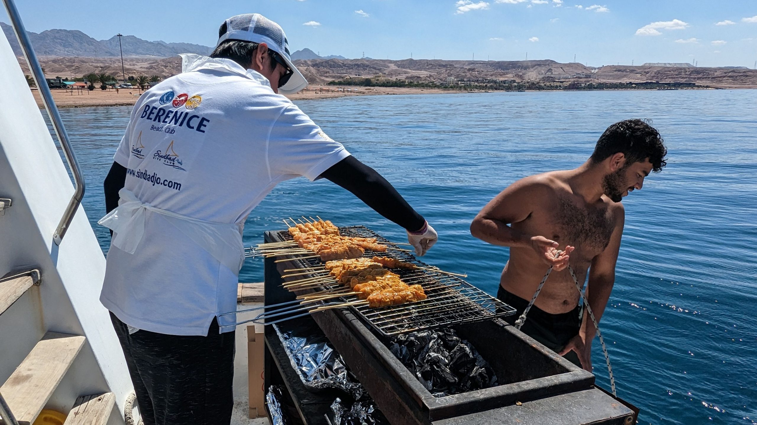 Nach einer weiteren halben Stunde sind alle wieder im Boot und es gibt ein Barbecue, das ein Philippinischer Koch am Heck auf dem Holzkohlengrill zubereitet hat. Zu den Spießen und dem Fisch stehen noch einige Schalen mit Salat, Hummes und verschiedenen anderen Köstlichkeiten auf dem Buffet. Alles schmeckt sehr gut. Jeder bekommt noch einen Softdrink und eine Flasche Wasser dazu. Wer Alkohol möchte, muss das selbst bezahlen. Danach fährt das Boot noch eine kleine Runde und wir können an der Küste den Strand und die anderen Resorts und Hotels sehen. Danach legen wir wieder am Steg an. Wir waren fast immer in Sichtweite zu unserem Resort aber es waren trotzdem 3 schöne Stunden auf dem Roten Meer. Das Wasser war nicht gerade warm aber auch nicht zu kalt.